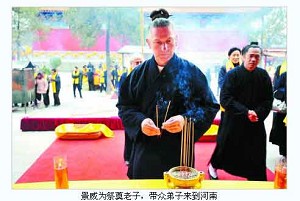 每逢阴历二月十五,传说中的老子生日,数十万人便会从世界各地赶到河南鹿邑,烧香祈福。而今年,来的人尤其多,还有洋弟子。 据河南商报3月12日报导,3月11日上午,纪念老子诞辰2580周年公祭大典在鹿邑明道宫举行,约30万人前来祭拜。历时一个月有着1000多年历史的老子庙会也同时开始。 老子的道家思想,从2000多年前起,就一直影响着中国。鹿邑祭奠老子的历史,已经有数千年了。每逢阴历二月十五,传说中的老子生日,数十万人便会从各地赶到鹿邑,烧香祈福。而今年来的人尤其多。 来自墨西哥的景威,是丘处机真人的三十二代弟子,他也带领着自己来自世界各地的弟子,与法国、瑞士、墨西哥、西班牙四个国家的道教朝圣团一起参加了祭拜。 景威十年前接触到了中医,然后对道教产生了浓厚兴趣。景威对道教文化很有研究,他在打坐中感悟到“气”和人生哲理。景威说:“道教文化使人心态平和,多年来,我总是想方设法吸引更多的欧洲人学习道教。我收了很多徒弟,向他们讲授中国文化和道教知识”。 鹿邑人把老子称为“老君爷”,11日,数十万人带着瓜果、馒头、香火,前来祭拜。他们边把祭品往供桌上放边念叨着:“老君爷,快来吃饭吧。”然后便是上香,明道宫内一时烟雾缭绕。 望着潮水一样的人群,一位道士揉着被香火熏红的眼睛,叹着气说:“道家讲的是清静无为,像这样闹哄哄地上香,老君爷也不一定会喜欢。”而来上香的百姓们不一定了解什么是清静无为,他们只有最单纯的愿望:为自己和家人祈福。 上传日期:2009.03.13 东方阳熹按: 当中国人把洋垃圾捡来,沉迷于大片、毛片、洋烟、洋酒、洋车、卡拉OK,自迷自性,昏头涨脑的时候,洋人却开始追求“心态平和”、“清净无为”了,你说当今的国人可笑不可笑,你说当今的国人愚不愚呢?