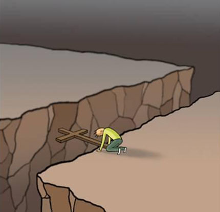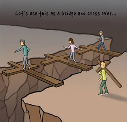 后面的人都慢慢地赶上来了,他们用自己背负的十字架搭在沟上,做成桥,从容不迫地跨越了沟壑。