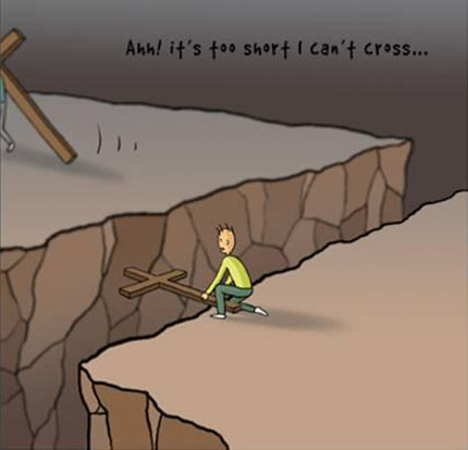 走着走着,谁料,前边忽然出现了一个又深又宽的沟壑! 沟上没有桥,周围也没有路。这时候也没有蜘蛛侠或者超人出来解救他……。他该怎么办呢?!