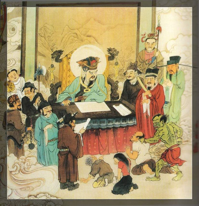 第七日为一周期,古今中外都如此,例如西洋七日一礼拜。生命之变异也一样,一旦人命终后,未受报前称为中阴身,中阴身之寿命七日一变化,死而复生,未得投胎之缘,顶多七七四十九日罪业审定,即发配各大小狱受报。 此期亲属为亡者修福追荐,令亡者最能受用其功德,可由劣地转为胜地,因而称此四十九日为慎终期。此后百日、周年次、三年次仍可追荐,称为追远期。七个七须经七个殿,百日、周年次、三年次,再经三殿,共计十殿,故本图又称“十王图”。年次年次祭祀,不忘孝德绵厚也。 一七为“第一殿秦广王”,秦广王心性至仁至孝,统辖人间寿命之长短,一生功过经由各地城隍、土地、查察司会报本殿,由秦广王亲审宣判,功过相当者,免受其刑直转第十殿转轮王处,或者点击照其生前所造善恶发放投胎,或男或女,或贫或富等承受其果报。罪孽深重者,发配各殿大小地狱去承受应得的酷刑以消业。 此时,秦广王正审判着一件子媳不孝,遗弃老父案件。夜叉拘来不肖子,他却大呼冤枉,老父无奈的据实指责,其媳则惭愧自责,掩面哭泣。在旁之城隍判官等陪审者,无不动怒,且举其罪状以供宣判。 慎终追远民德厚,万恶之极不孝人。