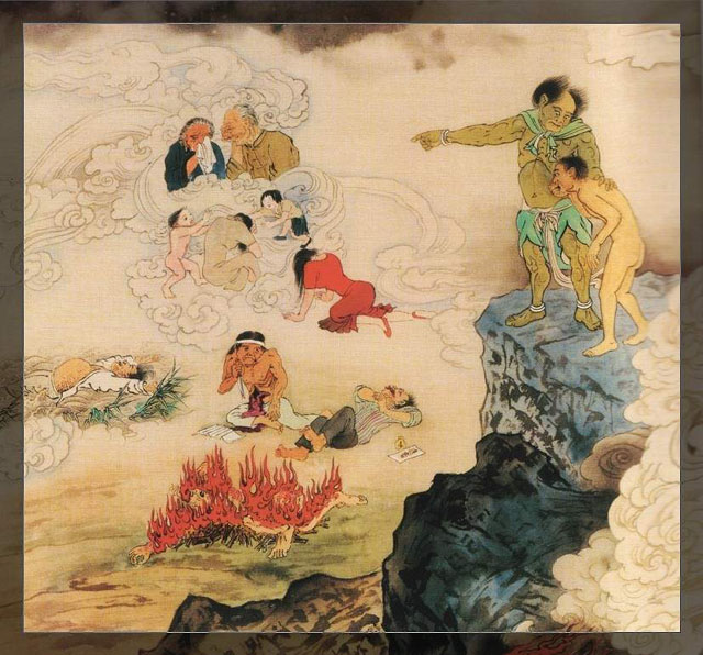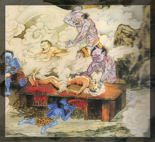 《经律异相》云:“犯邪淫者,男抱铜柱,女卧铁床。”又《正法念处经》云:“喜爱杀生,烧、烤、煎、烹、焖、燻众生肉,或践踏小虫者,死后均堕此狱;受其刑苦,时间极长,非人所能想像。”即便此罪消毕,倘有其他罪业,再堕其他地狱,一一受罪,直至罪业消竟。 杀生、淫乱,是地狱根本重罪,一切杀业都由贪、瞋而起,贪口欲,或瞋怒心而铸大错。一切众生谁愿意被杀,谁被杀而不含恨?既含恨,谁不伺机报复?杀生尚且如此,何况杀人?地狱乃公正廉明之社会,生前如何处置众生,死后必然相同对待,毫无变通折扣。 上传日期:2011.元.19 相关文章:
