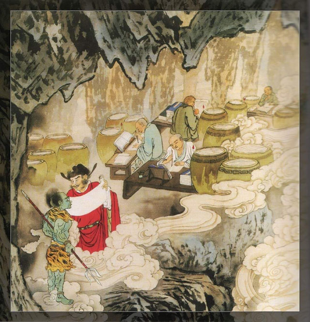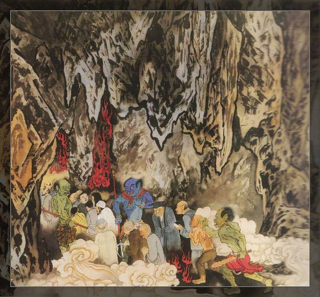 迷朦光中,几个青面差使,押解一批罪犯,在寒铁山洞穴中穿梭而过。这批罪犯,个个衣冠楚楚,看得出其生前之显赫与荣耀,从服饰穿着来看,有不同的阶级与地位;有的应该是政客,有的应是掌有权位的学者,在他们的神色之间,根据然残留几分得意与跋扈。孱杂人群中也有宗教人士、神职道侣,享尽人间一切福报,辜负众生之供养。此时个个神情凝重,似乎已嗅到“大事不妙”的气息。