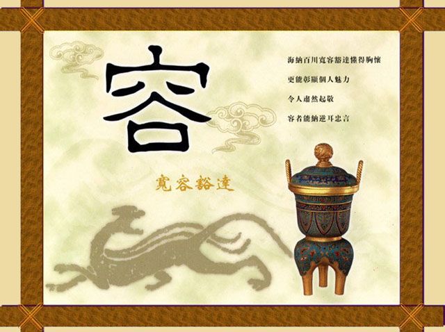海纳百川宽容豁达懂得胸怀 更能彰显个人魅力 令人肃然起敬 容者能纳逆耳忠言 处难处之事愈宜宽;处难处之人愈宜厚;处至急之事愈宜缓。 必有容德乃大;必有忍事乃济。