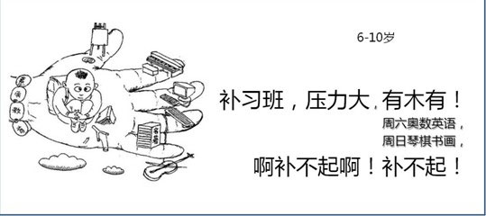 6~10岁补习班,压力大,有木有 你写,或者不写,作业就在那里,不增不减。你上,或者不上,辅导班就在那里,不更不变。你听,或者不听,老师就在那里,不离不弃。你躲,或者不躲,考试就在那里,不悲不喜。……这是一位小学生模仿诗歌《见与不见》编的词。有点幽默,有点沉重,却是小学生的心里话。 在唯分数论的促动下,学校、家长、孩子,都在不断的扩大着补习班、培训机构的存活空间。很多学生被迫报的班越来越多,书包越来越重,现实情况表明,喊了多少年的“学生减负”成了一个名副其实的空口号。