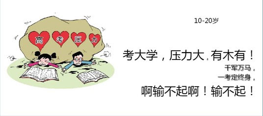 10~20岁考大学,压力大,有木有 今年的高考、中考即将来临,奋战在一线的学子们已经展开了最后的冲刺。同时,不少学生倍感“鸭梨山大”。其实,压力何止大考之前这段时间呢?对大部分莘莘学子来说,初中三年为中考,高中三年的唯一目标是高考,尤其在现在面临很大的就业压力的情况下,在面临家长们望子成龙望女成凤的期盼下,学生们怎能不“鸭梨山大”?