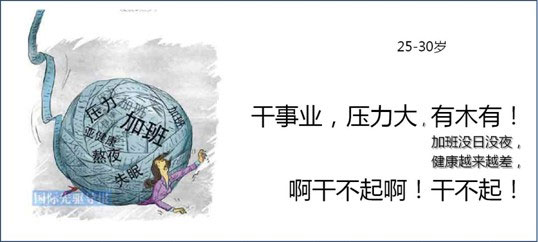 25~30岁干事业,压力大,有木有 面临激烈的社会竞争,谁的工作压力不大?一项针对5000名职场人士展开的健康特别调查结果显示:目前,近七成职场人认为自己存在“过劳”迹象,浑身酸痛、烦躁、抑郁是“过劳”三大杀手。工作压力大怎么办?只能自己调节。激励自己吧,化压力为动力吧……