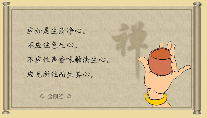 应如是生清净心。 不应住色生心。 不应住声香味触法生心。 应无所住而生其心。