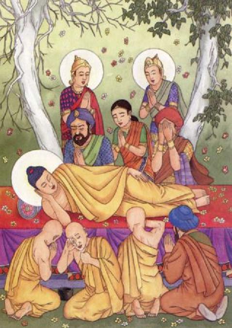 佛陀不久进入了拘尸那迦罗城,吩咐阿难道:“你去为我在娑罗双树间敷座设床,头在北面向西。我的教法最近可以北方弘传,未来也会盛行在西方。我于今夜将入涅槃。” 阿难和大家听了都泪流不止。后来大家商量光是这样啼哭没有甚么用,要紧的是向佛陀请示,未来如何使正法久住。经过商量以后,公推阿难请问佛陀道: “佛陀!我们弟子大家禁不住伤感之情,有四个问题最后请示佛陀: “佛陀!我们弟子大家禁不住伤感之情,有四个问题最后请示佛陀: “第一、佛陀住世的时候,我们大家依佛陀为师,佛陀涅槃以后,我们依谁为师呢? “第二、佛陀住世的时候,我们依佛陀安住,佛陀涅槃以后,我们依甚么而安住呢? “第三、佛陀住世的时候,凶恶的人有佛陀调伏,佛陀涅槃以后,凶恶的人如何去调伏呢? “第四、佛陀住世时,佛陀的言教,大家易生信解,佛陀涅槃以后,经典的结集,如何才能叫人起信呢?” 佛陀慈祥恺悌的回答道: “阿难!你代表大家提出这四个问题来问我,确实非常重要。 “你们不要这么悲泣,要是舍利弗和目犍连还是在世的话,一定不会像你们这样;大迦叶此刻还在途中,我涅槃前他是来不及赶到。你们要认识法性。佛陀如果以应身住世的话,这终是无常之相;唯有佛陀进入涅槃,你们依法而行,才是佛陀常住在世间! “我现在答覆你们的四个问题,你们好好的记着: “第一、你问我涅槃以后,依谁为师:应依戒为师。 “第二、你问我涅槃以后,应依何安住:应依四念处安住。 “第三、你问我涅槃以后,恶人如何调伏:应默摈置之。 “第四、你问我涅槃以后,经典如何叫人起信:应在一切经首安‘如是我闻’之句。 “阿难!你们应常常思慕佛陀的生处,佛陀的悟处,佛陀的说法处,佛陀的涅槃处。要紧的是身常行慈,口常行慈,意常行慈。别的不用挂心,现在不要悲伤,赶快去娑罗双树间为我敷座设床。” 佛陀的话,阿难和大家听得更感动、更伤心! 佛陀在娑罗双树间,左近有五百力士听说佛陀将要进入涅槃,大家都来向佛陀顶礼。这以后,又有一个外道须跋陀罗,年龄已一百余岁,在外道中是很有学识道德的长者。然未闻正法,始终没有开悟。这一天听说大觉佛陀要在这里涅槃,想到慧灯将要熄灭,法船将要沉没,他不得不带着勇气匆忙的前来向佛陀请教,以打破他胸中一向的疑团。须跋陀罗到达娑罗双树,穿过重重跪在地下皈依佛陀的人。正当阿难侍奉着佛陀,阿难一见来者是个外道,怕他是来和佛陀辩论,赶快向前阻拦道:“请你不要再来打扰佛陀,佛陀今夜将要涅槃。”须跋陀罗向阿难尊者要求道:“正是因为听说佛陀将要涅槃我才来的。我此时已感觉到佛世难遇,正法难闻。请你帮忙,我心中有个疑团一定要佛陀才能解决!”这时候,阿难是再三的辞谢,须跋陀罗是再三的请求。大悲的佛陀,不舍众生,听到求道者的声音,即喊阿难道:“阿难!他不是来和我论战的,他是须跋陀罗,是我最后的弟子。让我去除他的疑惑,让他来和我见面。” 阿难没有办法,只得带须跋陀罗引见佛陀,须跋陀罗很是欢喜的问道: “佛陀!世间上所有的沙门、婆罗门、六师外道,都说自己是一切智人,又说除他以外,其他的宗教都是邪宗邪教,自己所行的是解脱大道,别人都是错入歧途。这样互相非难,这正邪究竟如何分别呢?是非究竟以甚么为标准呢?我们究竟应该如何才能得到解脱呢?” 佛陀欢喜微笑着回答道: “须跋陀罗!你问得很好,我很高兴为你解答。世间上无论那一个修行者,如果他不知道‘诸行无常’、‘诸法无我’、‘涅槃寂静’的三法印,他就不能认识诸法的根本;他如果不修学‘正见’、‘正思惟’、‘正语’、‘正业’、‘正命’、‘正精进’、‘正念’、‘正定’的八圣道,他就不是真正的修道者,就不能获得自在和解脱。 “须跋陀罗!世间上谁的法中有三法印和八圣道呢?我以真实的话告诉你,唯佛陀的法中才有八圣道,唯佛陀的教法中才有真正解脱的沙门,唯佛陀才是一切智人。 “须跋陀罗!观察外道的教法,他们不依三法印,没有八圣道,当然就没有解脱的修道者。虽然他们说有,那不过都是妄言。 “须跋陀罗!我八十年前四月初八日降生在王宫,后来受教育时也曾被六师外道所迷。我十九岁那年二月初八日出家,三十一岁那年十二月初八日在菩提树下成道,今天是八十岁的二月十五日,我于午夜在此娑罗双树间涅槃。 “须跋陀罗!从我成道的时候起,这个世间上才真正的有沙门;我涅槃后,留正法于人间,信仰的人定能获得解脱。佛陀才真正是一切智慧之源。” 须跋陀罗听闻佛陀的真理之音,心中的迷雾顿时开朗,当即证得阿罗汉果。他顶礼佛陀的圣颜,发愿作佛陀住世最后的弟子,并在佛陀身旁先入涅槃。大家见了都很感动。 佛陀以吉祥卧的姿势卧在娑罗双树之间床上,很多的弟子围绕在佛陀的四周,大家都是揩鼻抹泪。这时,风息林静,鸟兽没有鸣声,树木之皮流出水滴,百花都萎谢凋零。整个的世间都现出寂寞萧条的现象。 佛陀心如止水,和平常说法没有两样,静静的向诸弟子作最后的遗教: “诸比丘弟子!我涅槃以后,你们要尊敬珍重波罗提木叉,善为受持,不要遗忘。戒就是指导你们的大师,你们持戒,如贫穷的人得到宝物,如黑暗中燃起明灯。这和我住世,没有甚么不同。 “诸比丘弟子!你们要弘通正法,从事自利利他和救人救世的真理运动,不要贪图财利,不要贩卖贸易,安置田宅。你们修道