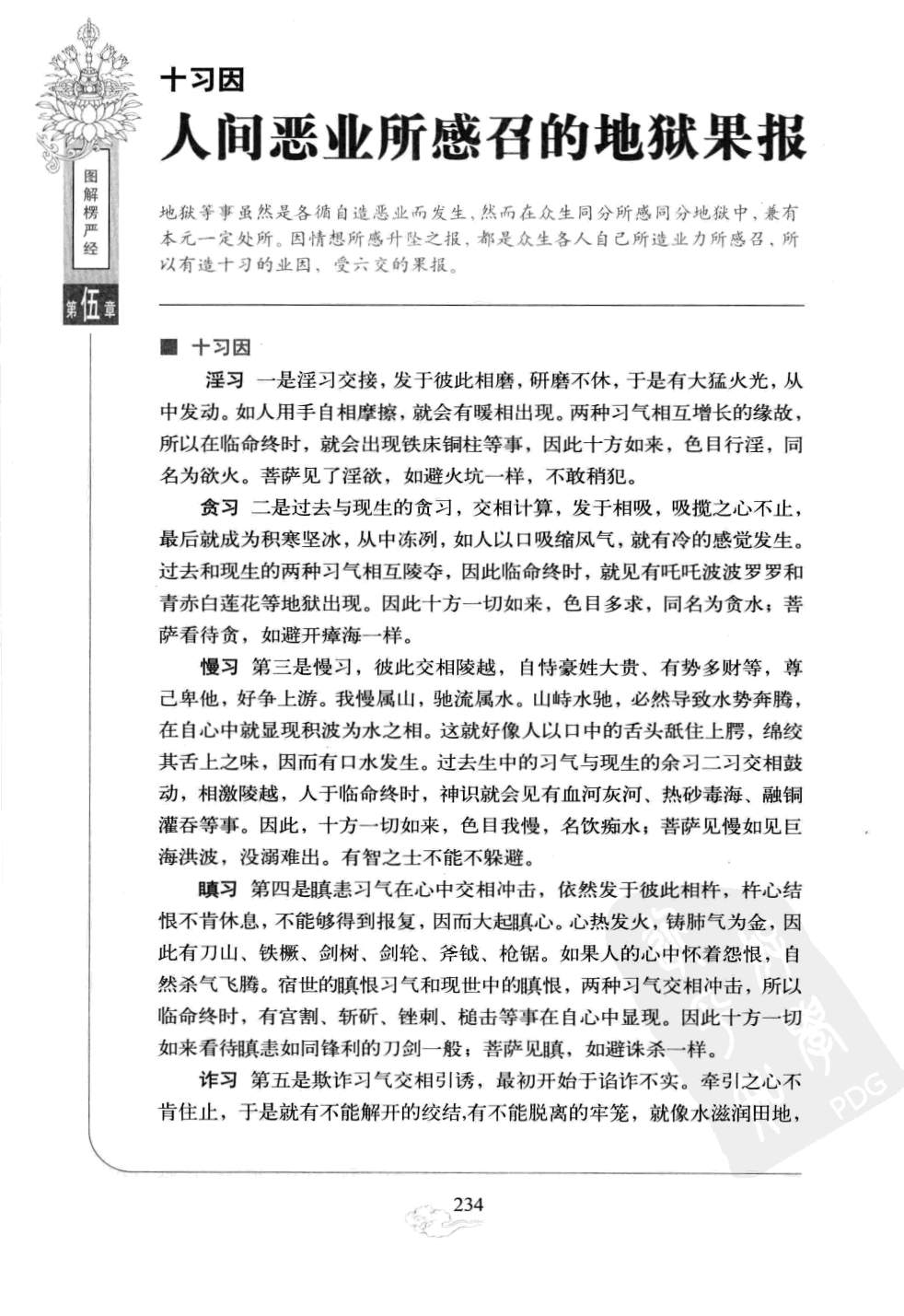 五、诈习第五是欺诈习气交相引诱,最初开始于谄诈不实。牵引之心不肯住止,于是就有不能解开的绞结,有不能脱离的牢笼,就像水滋润田地,草木就会悄悄生长一样。宿世的习气和现生的习气交相延引,所以使人临命终时会看见有枢械枷锁和鞭杖挝棒等事。因此,十方一切如来看待奸伪欺诈,如同谗言哄诱的贼人;菩萨看见奸诈,如同害怕豺狠一样。
