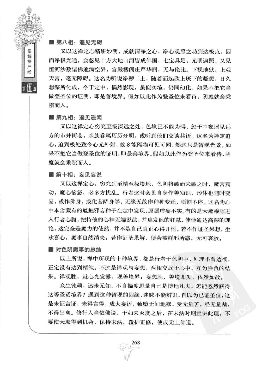 行者处于色阴区宇中,对种种境界能够不把它当做登圣位的证明,不起执著心,那就是色阴将破的吉祥之兆。假如贪著种种境界,以此作为登圣位来看待,阴魔就会乘隙而入。 色阴区宇的境界佛对阿难说,你应当知道,你坐道场时,销落一切心念。心念若是尽时,那么这离念之心,本具根性,即时显现,一切时,一切处,精而不杂,明而不昧。动静不移,忆忘如一。当其住于此处,入三摩提,正如明目的人处于大幽暗中,虽然六精之性的妙净明心本来周遍法界,无奈色阴未开,心光未发,这时名为色阴区宇。如果目的明白朗照,内彻五脏百骸,外彻山河大地,虽然未能圆鉴大千,而眼前十方所有之处,没有不洞达开通的,不再幽暗,就称为色阴尽。这个人从此能超越劫浊。观看色阴所生起的缘由,是以坚固妄想作为它的根本的。 第一相:身能出碍在这色阴区宇之中,精研妙明之时,妄想不起定力增强,于是内外四大虚融,如云如影,不再密织而成坚实。顷刻之间,这色身就能穿墙透壁,无所障碍,这名为心精妙明流溢于当前根、尘坚实之境,由于定力的逼使,暂得虚融之相,稍懈即失。如果不把它当做登圣位的证明,即是善境界。假如以此作为登圣来看待,阴魔就会乘隙而入。 第二相:内彻拾虫复次,以这禅定心精研妙明之时,反闻功深,光明内照,身中莹彻,此人忽然于自身内拾出蛲蛔等虫,而身体完好,毫无毁伤,这就名叫心精妙明流溢于形体,使五脏虚融,四肢透彻。这不过是精研功行的逼拶,暂得身内莹彻。如果不把它当做登圣位的证明,即是善境界。假如以此作为登圣位来看待,阴魔就会乘隙而入。 第三相:精魄离合又以这禅定心,精研内身、外境,悉皆虚融,定力增胜,这时魂、魄、意志、精、神等,除却能感受的身体不改常态外,其他皆交相涉入,互为宾主,会忽然听到空中有说法的声音,或能听到十方同时宣说微密妙义。这名为精与魄等,依次互相离合,夙昔所成就的善因种习暂时地显现。如果不把它当做登圣位的证明,即是善境界。假如以此作为登圣位来看待,阴魔就会乘隙而入。 第四相:境变佛现又以这禅定心澄净独露,皎然莹彻,心光明照,遍见十方世界皆成阎浮檀金色,各种众生都化为如来。这时会忽然看见毗卢遮那佛踞坐于天光台上,受千佛围绕,百亿国土以及莲花,也同时出现。这名为心魂灵悟所染的习气,由于心光研究发明,故能照诸世界,这不过偶然发露,暂得这种特尊身相。如果不把它当做登圣位的证明,即是善境界。假如以此作为登圣位来看待,阴魔就会乘隙而入。 第五相:空成宝色又以这禅定心精研妙明的闻性,不断地观察(慧),抑制自心(定),降伏妄念,并欲阻止定超于慧,期使定慈均等,因用功太过,这时会忽然见到十方虚空皆成七宝颜色,甚至百宝颇色,虽色彩各异,但同时遍满虚空,互不相碍,青黄赤白各各保持纯色。这名为抑制的功力过强,反使定超于慧,暂时所现的幻象。如果不把它当做登圣位的证明,即是善境界。假如以此作为登圣位来看待,阴魔就会乘隙而人。 第六相:暗中见物又以这禅定心,因精研穷究而澄寂明彻,心光凝然,不因明暗而变易扰乱。这时会忽然于黑夜中,或暗室内,也能见种种对象,和白天一样。而暗室中物,一如往常也不会消失。这名为心光细密,密澄其见,所以能见幽察微,但这是暂时的发露。如果不把它当做登圣位的证明,即是善境界。假如以此作为登圣位来看待,阴魔就会乘隙而入。 第七相:身同草木又以这禅定心反闻自性的功深,内身外境一片虚融,忘身如遗,四肢忽然如同草木,火烧刀砍,毫无感觉;火烧不热,刀割其肉,也像削木头一样。这名为诸尘并销,排遣四大性,一向反闻,既专且切,纯觉遗身,偶然如此。如果不把它当做登圣位的证明,即是善境界。假如以此作为登圣位来看待,阴魔就会乘隙而入。 第八相:遍见无碍又以这禅定心精研妙明,成就清净之心,净心观照之功到达极点,因而净极光通,会忽见十方大地山河皆成佛国,七宝具足,光明遍照。又见恒河沙数诸佛遍满空界,宫殿楼阁庄严华丽,无与伦比。下视地狱,上观天宫,毫无障碍。这名为听说净秽二土,随着而起欣上厌下的凝想,日久想深所化成,今于定中,偶然影现,虽似实魂,仍同幻化。如果不把它当做登圣位的证明,即是善境界。假如以此作为登圣位来看待,阴魔就会乘隙而入。 第九相:遥见遥闻又以这禅定心穷究至极深远之处,色境已不能为碍,忽于中夜遥见远方的市井街巷,亲族眷属历历分明,或听到他们交谈共语。这名为禅定迫心,迫到极处致令心光外射,故多能隔物可见可闻,然这只是暂现光景。如果不把它当做登圣位的证明,即是善境界。假如以此作为登圣位来看待,阴魔就会乘隙而入。 第十相:妄见妄说又以这禅定心,穷究到至精至极境地,色阴将破而未破之时,魔宫震动,魔心恼怒,必多方扰乱。行者这时会见自身作善知识,形体也随时变易,或作佛身,或化菩萨身等,无缘无故作种种变迁,顷刻不停。这名为心中本含藏有的魑魅邪妄种子在定中发现,原属虚妄不实。有的是天魔乘隙进入行者心腹,把持他的心神无端说法,并启发他的狂慧,使他通达高深的理论,这完全是魔力的使然,并不是自己真正心得开悟。若不作证圣果想,生欢喜心,魔事自然消失;若作证圣果解,便会被群邪所惑,无可哀救。 对色阴魔事的总结以上所说,禅中所现的十种境界,都是行者于色阴中,见理不曾透彻,正定没有达到精纯,不过是禅观与妄想,两相