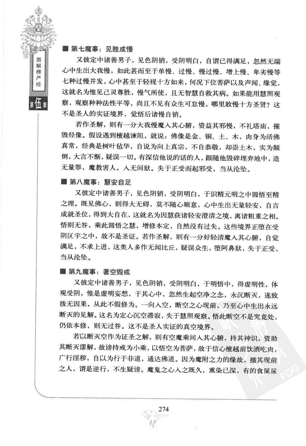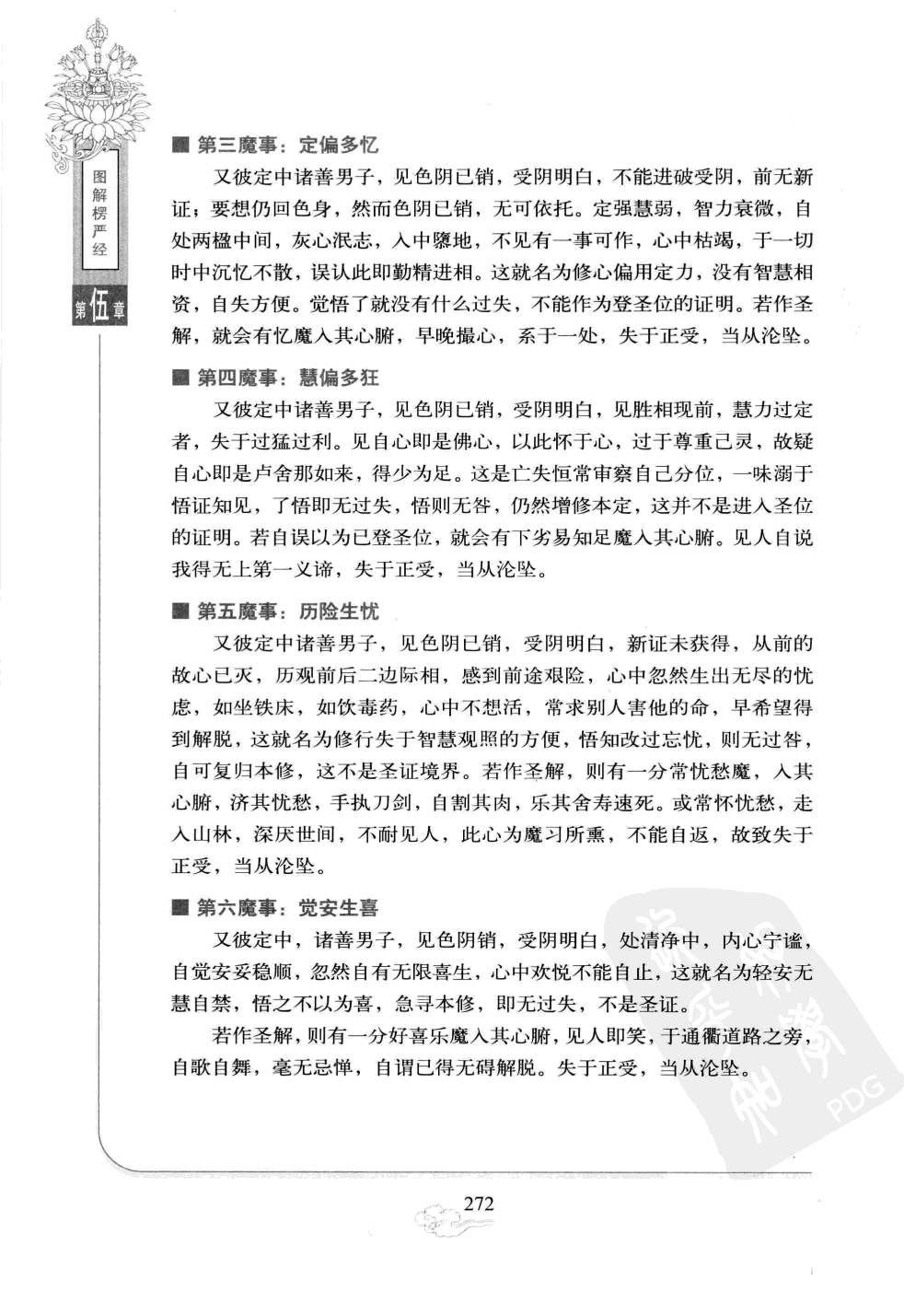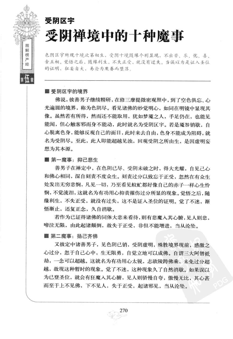色阴区宇所现十境次第相生。受阴十境随缘个别显现,不出苦、乐、忧、喜、舍五相。觉悟之后,随缘利生,不失正受,就没有过失。当误以为是证入圣位的证明,狂妄自大,易沦为魔眷而堕落。 受阴区宇的境界佛说,彼善男子继续精研,在修三摩提微密观照中,到了空色俱忘、心光遍圆的境界,称为色阴尽。看见诸佛的妙觉明心,如同在明镜中显现其像。虽然若有所得,然而还不能取用,犹如梦魇之人,手足仍在,也能见能闻,但心触客邪而身不能动,此时就名为受阴区字。若是魇咎销歇,自心脱离色身,能够反观自己的面目,此时来去自由,色身不能成为阻碍,就名为受阴尽。至此,此人即能超越见浊,回观受阴之所由生,是因虚明妄想为其本源。 第一魔事:抑己悲生善男子在禅定中,在色阴已尽,受阴未破之时,得大光耀,自见己心和佛心相同,深自刻责不度众生。刻责过分以致忘于正受,忽然在有众生处发出无穷悲悯,凡见一切,乃至看见蚊虻都好像自己的赤子一样心生怜悯,不觉流泪,这就名为有功用心抑责摧伤过分所显的现象。觉悟之后,随缘利生,不失正受,就没有过失,这不是证入圣位的证明。觉了不迷,渐悟渐止,还复正念,久自消歇。 若作为已证得诸佛的同体大悲来看待,则有悲魔入其心腑,见人则悲,啼泣无限,由此起诸颠倒,故失于正受,非但不能增进,当从沦坠。 第二魔事:扬己齐佛又彼定中诸善男子,见色阴已销,受阴虚明,殊胜境界现前,感激之心过分,忽于自己心中,生无限勇,自觉立地可以成佛。自谓三大阿僧祇劫,一念可以超越。这就名为有功用心太锐,志欲陵跨佛乘,未免过分超越,故现这种暂时的现象。觉了不迷,这种现象久了自然消歇。如果误以为已登圣位,就会有狂魔入其心腑,见人则骄慢自夸,傲慢无比,其心甚而至于上不见佛,下不见人,失于正受,起诸邪见,当从沦坠。 第三魔事:定偏多忆又彼定中诸善男子,见色阴已销,受阴明白,不能进破受阴,前无新证;要想仍回色身,然而色阴已销,无可依托。定强慧弱,智力衰微,自处两楹中间,灰心泯志,入中隳地,不见有一事可作,心中枯蝎,于一切时中沉忆不散,误认此即勤精进相。这就名为修心偏用定力,没有智慧相资,自失方便。觉悟了就没有什么过失,不能作为登圣位的证明。若作圣解,就会有忆魔入其心腑,早晚撮心,系于一处,失于正受,当从沦坠。 第四魔事:慧偏多狂又彼定中诸善男子,见色阴已销,受阴明白,见胜相现前,慧力过定者,失于过猛过利。见自心即是佛心,以此怀于心,过于尊重己灵,故疑自心即是卢舍那如来,得少为足。这是亡失恒常审察自己分位,一味溺于悟证知见,了悟即无过失,悟则无咎,仍然增修本定,这并不是进入圣位的证明。若自误以为已登圣位,就会有下劣易知足魔入其心腑。见人自说我得无上第一义谛,失于正受,当从沦坠。 第五魔事:历险生忧又彼定中诸善男子,见色阴已销,受阴明白,新证未获得,从前的故心已灭,历观前后二边际相,感到前途艰险,心中忽然生出无尽的忧虑,如坐铁床,如饮毒药,心中不想活,常求别人害他的命,早希望得到解脱,这就名为修行失于智慧观照的方便,悟知改过忘忧,则无过咎,自可复归本修,这不是圣证境界。若作圣解,则有一分常忧愁魔,入其心腑,济其忧愁,手执刀剑,自割其肉,乐其舍寿速死。或常怀优愁,走入山林,深厌世间,不耐见人,此心为魔习所熏,不能自返,故致失于正受,当从沦坠。 第六魔事:觉安生喜又彼定中,诸善男子,见色阴销,受阴明白,处清净中,内心宁谧,自觉安妥稳顺,忽然自有无限喜生,心中欢悦不能自止,这就名为轻安无慧自禁,悟之不以为喜,急寻本修,即无过失,不是圣证。 若作圣解,则有一分好喜乐魔入其心腑,见人即笑,于通衢道路之旁,自歌自舞,毫无忌惮,自谓已得无碍解脱。失于正受,当从沦坠。 第七魔事:见胜成慢又彼定中诸善男子,见色阴销,受阴明白,自谓已得满足,忽然无端心中生出大我慢,如此甚而至于单慢、过慢、慢过慢、增上慢、卑劣慢等七种过慢并发,心中甚至于轻视十方如来,何况下位菩萨以及声闻、缘觉,这就名为惟见己灵尊胜,慢气所使,且无智慧自救其病。如果能用慧照观察,观察种种法性平等,尚且不见有众生可怠慢,哪里敢慢十方圣贤?这不是圣人的实证境界,觉悟后诸慢自销。 若作圣解,则有一分大我慢魔入其心腑,资益其邪慢,不礼塔庙,摧毁经像。假设遇到檀越谏阻,就说:佛像是金、铜、土、木,肉身为活佛真常,经典是树叶毡华,自说为向上真宗,不自恭敬,却崇土木,实为颠倒,大言不惭,疑误一切。有深信他说的话的人,跟随他毁碎埋弃地中,造无量罪,魔教害人,入无间狱。失于正受而起邪受,当从沦坠。 第八魔事:慧安自足又彼定中诸善男子,见色阴销,受阴明白,于识精元明之中圆悟至精之理。既见佛心,则得大无碍,莫不随心顺意,心中生出无量轻安,自言成就圣位,得到大自在,这就名为因慧获诸轻安澄清之境,离诸粗重之相。悟则无咎,乘此圆悟之慧,增修本定,自然没有过失。这些境界正堕在受阴区宇之中,故不是圣证。若作圣解,则有一分好轻清魔入其心腑,自觉满足,不求上进,这类人多作无闻比丘,疑误众生,堕阿鼻狱,失于正受,当从沦坠。 第九魔事:著空毁戒又彼定中诸善男子,见色阴销,受阴明白,于明悟中,得虚明性,体观受阴,惟是虚明妄想,于其心中,忽然生起空净之念,永沉断灭,遂致拨无因果,从此不假修为。一向入空,断空之心现前,乃至心中生出