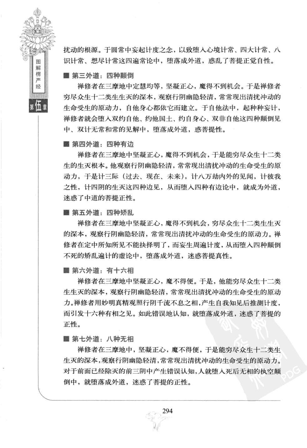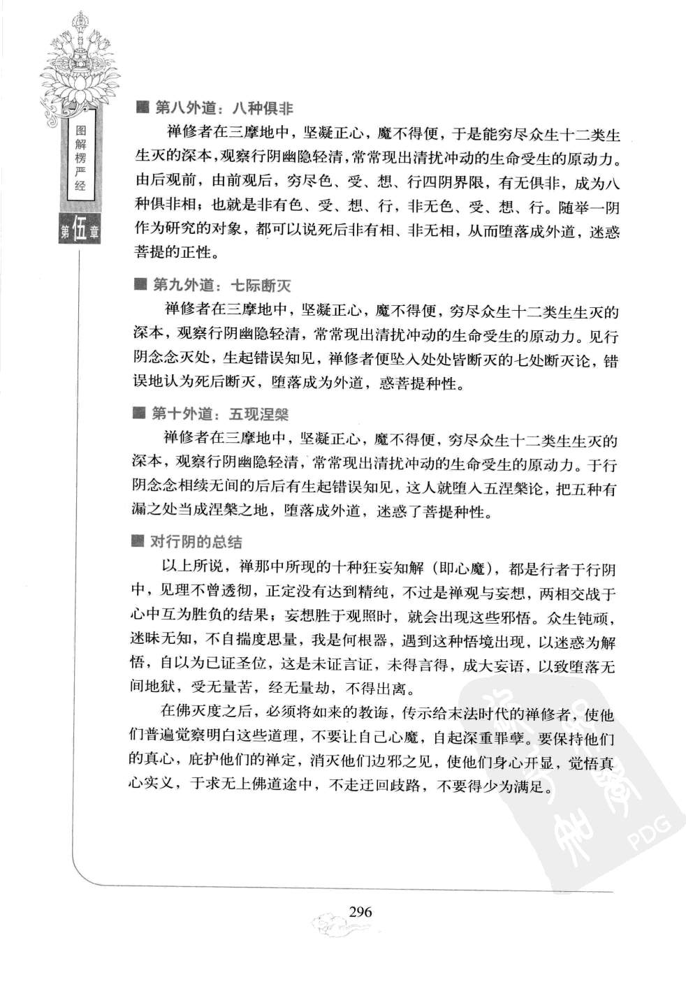 在行阴区宇中,行者已经不属外境魔事的干扰,而是自己就禅定中所观察到的现象而生起种种错误知见,只是自心邪解作孽,所以称为心魔。就其中的十种狂妄知见来看,不出断见与常见两种。 行阴区宇的境界佛说,禅修者在修三摩提中,想阴尽后,动念全销,浮想亦除,故昼则无想,夜也无梦,平常梦想消灭,寤寐如一,觉明虚静犹如晴空。此时不再有粗重前尘影事,观察世间大地山河,虽然万象俱现而无所分别,如镜鉴明,来无所黏,过无踪迹。境现识中,不过虚受照应,绝六尘之杂染,故来无所黏;了无陈习,知六识的伪妄,故过无踪迹,只留有惟一精真的第八本识。 作为第八识中所含七识种子的生灭根源,从此披露。虽未得通达十二类生,各各受命元由头绪,而见七识种子同分生基,犹如野马熠熠清扰。浮根四尘是众生的根身。十二种类各各不同,而究竟转变之机完全在于行阴。由于行阴的存在,根尘得以生灭。行相不尽,生死难脱,所以这种魔界名为行阴区宇。 若此清扰熠熠元性,性入元澄,一橙元习,如波澜灭,化为澄水。至此即名为行阴尽,此时即能超众生浊。回观产生行阴的根源,在于第八识中的七识种子,幽深隐微,生灭妄想以它为本。 第一外道:两种无因禅修者如果能正确地认识到,在圆定发明中,诸善男子,不动不惑,定慧均等,不起十种邪求,十类天魔无隙可乘,方得精心研究,力破想阴,行阴即现,才能穷究十二类生的生灭根本。欲于本类中研求生灭,根源显露。观察行阴幽隐轻清,以迁流的微细动相为圆扰群动之原。于圆扰群动之原,为诸行之本,是生灭之原。如是观察,执为殊胜之性,所以生起计渡。却不知道有不扰不动的真如,亡失本修,因此落入本无因和末无因两种无因论的窠臼中。如此错误认知,以致堕落成外道恶见,惑乱菩提正觉之性。 第二外道:四种遍常禅修者在三摩地中定慧均等,魔不得便,于是穷生类本,观彼幽清常扰动的根源。于圆常中妄起计度之念,以致堕入心境计常、四大计常、八识计常、想尽计常这四遍常论中,堕落成外道,惑乱了菩提正觉自性。 第三外道:四种颠倒禅修者在三摩地中定慧均等,坚凝正心,魔得不到机会。于是禅修者穷尽众生十二类生生灭的深本,观察行阴幽隐轻清,常常现出清扰冲动的生命受生的原动力,自他身心都依它而建立。于自他法中,起种种妄计,禅修者就会堕入双约自他、约他国土、约自身心、双非自他这四种颠倒见中、双计无常和常的见解中,堕落成外道,惑菩提性。 第四外道:四种有边禅修者在三摩地中坚凝正心,魔得不到机会,于是能穷尽众生十二类生的生灭根本。他观察行阴幽隐轻清,常常现出清扰冲动的生命受生的原动力,于是计三际〔过去、现在、未来),计八万劫内外的见闻,计彼我之性,计四明的生灭这四种边见,从而堕入四种有边论中,就成为外道,迷惑了中道的善提正性。 第五外道:四种矫乱禅修者在三摩地中坚凝正心,魔得不到机会,穷尽众生十二类生生灭的深本,观察行阴幽隐轻清,常常现出清扰冲动的生命受生的原动力。禅修者在定中所知所见不能抉择明了,而妄生周遍计度,从而堕入四种颠倒不死的矫乱遍计的虚论中,堕落成外道,迷惑菩提真性。 第六外道:有十六相禅修者在三摩地中坚凝正心,魔不得便。于是,他能穷尽众生十二类生生灭的深本,现察行阴幽隐轻清,常常现出情扰冲动的生命受生的原动力。禅修者用妙明真精观照行阴千流不息之相,产生自我知见后推测计度,而引发十六种有相之见。如此错误地认知,就堕落成外道,迷惑了善提的正性。 第七外道:八种无相禅修者在三摩地中,坚凝正心,魔不得便,于是能穷尽众生十二类生生灭的深本,观察行阴幽隐轻清,常常现出清扰冲动的生命受生的原动力。对于前面已经除灭的前三阴中产生错误认知,人就堕入死后无相的执空颇倒中,就堕落成外道,迷惑了菩提的正性。 第八外道:八种俱非禅修者在三摩地中,坚凝正心,魔不得便,于是能穷尽众生十二类生生灭的深本,观察行阴幽隐轻清,常常现出清扰冲动的生命受生的原动力。由后观前,由前观后,穷尽色、受、想、行四阴界限,有无俱非,成为八种俱非相;也就是非有色、受、想、行,非无色、受、想、行。随举一阴作为研究的对象,都可以说死后非有相、非无相,从而堕落成外道,迷惑菩提的正性。 第九外道:七际断灭禅修者在三摩地中,坚凝正心,魔不得便,穷尽众生十二类生生灭的深本,观察行阴幽隐轻清,常常现出清扰冲动的生命受生的原动力。见行阴念念灭处,生起错误知见,禅修者便坠入处处皆断灭的七处断灭论,错误地认为死后断灭,堕落成为外道,惑菩提种性。 第十外道:五现涅槃禅修者在三摩地中,坚凝正心,魔不得便,穷尽众生十二类生生灭的深本,观察行阴幽隐轻清,常常现出清扰冲动的生命受生的原动力。于行阴念念相续无间的后后有生起错误知见,这人就堕入五涅槃论,把五种有漏之处当成涅槃之地,堕落成外道,迷惑了菩提种性。 对行阴的总结以上所说,禅那中所现的十种狂妄知解(即心魔),都是行者干行阴中,见理不曾透彻,正定没有达到精纯,不过是禅观与妄想,两相交战于心中互为胜负的结果;妄想胜于观照时,就会出现这些邪悟。众生钝顽,迷昧无知,不自揣度思量,我是何根器,遇到这种悟境出现,以迷惑为解悟,自以为已证圣位,这是未证言证,未得言得,成大妄语,以致堕落无间地狱,受无量苦,经无量劫,不得出离。