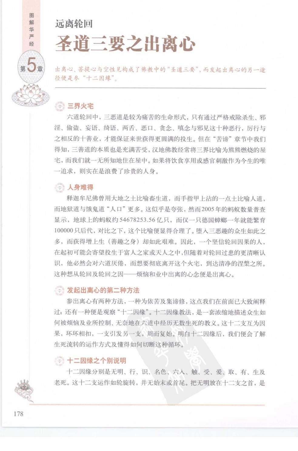发起出离心的第二种方法参出离心有两种方法,一种为依苦及集谛修,这点我们在前面已大致阐释过:还有一种便是观察“十二因缘”。十二因缘教法,是一套浓缩地描述众生如何被烦仙及业所控制、无奈地在六道中经历无数生死的教义。这十二支互为因果,环环相扣,一支引发另一支,周而复始。明白十二因缘后,我们便会了解生死流转的运作方式及懂得如何切断这种循环。