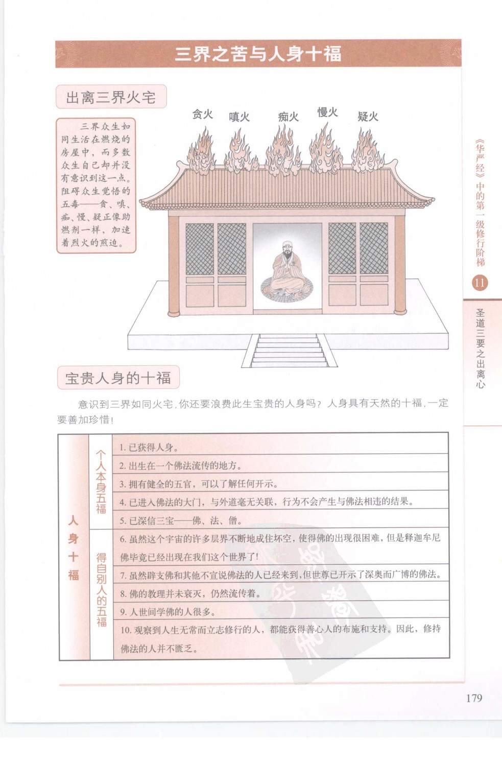 三界火宅六道轮回中,三恶道是较为痛苦的生命形式,只有通过严格戒除杀生、邪淫、愉盗、妄语、绮语、两舌、恶口、贪念、嗔念与邪见这十种恶行,厉行与之相反的十善业,才能保证来世获得更圆满的投生。但在“苦谛”章节中我们得知,三善道的本质也是充满苦受,汉地佛教经常将三界比喻为熊熊燃烧的屋宅,而我们就一无所知地住在屋中。如果将饮食享用或感官刺激作为今生的唯一追求,则实在是浪费了珍贵的人身。