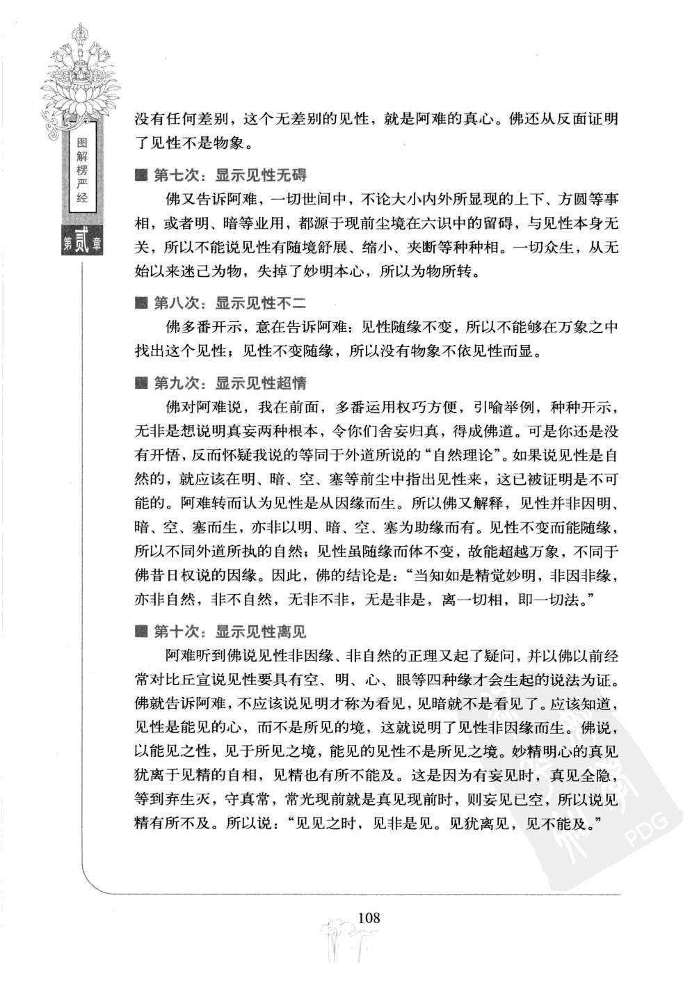 如果说“七处征心”是破妄,那么“十番显见”则是显真。破妄,则能破除妄心的虚妄;显真,则显露出能代表“万象丛中独露身”的妙明真心的见性。阿难因为听到佛说,入九次第定中最顶级的灭受想定,仍然不算见到妙明真心,那么寻常所用的攀缘识心更不必说了。所以悲泪礼佛,开始真正发露忏侮,特别想证悟本有的妙明真心。佛为了使阿难言下契入真心,又一次亮出了他的光明拳,问了阿难三个逻辑严密的问题:“此拳光明因何所有?云何成拳?汝将谁见?”从而成为影响极大的“十番显见”论辩的开端。 第一次:显示见性是心非眼 佛告诉阿难,眼睛不是见性存在的充分必要条件,说盲人不能看见是一个常识性错误。“睹暗”实际也是一种看见,只不过所见到的是一片黑暗而已;如果真看不见,那盲人应该连眼前的黑暗也看不到。佛举例说,一个瞎子所见到的黑暗,与一个视力正常的人在黑暗中见到的黑暗完全相同;假如眼睛瞎了的人把眼病治好了,那么就能在白天很正常地看到眼前的一切,与正常人白天看到的没有两样,这就证明瞎子的“见性无亏”。 第二次:显示见性不动 由于阿难与诸大众仍然没有开悟,佛就请开悟成阿罗汉的法性长老憍陈那站起来说说他悟道的经过。憍陈那长老说,他当初因为听到客尘烦恼的道理而开悟证果。众生自心所现的粗烦恼就好像旅馆中的客人,客人不会住下来,吃完饭准备好就会离开,而妙明真心就好像主人,会安住下来,不会离开。从自心所现的微细烦恼又好像夏天的日光射入门缝中,能看见光束中许许多多乱动的灰尘,而妙明真心则好像虚空一样不会有丝毫动摇。佛又屈拳握掌开合,阿难立即明白了手掌有开合,但见性没有开合。 第三次:显示见性不灭 这时波斯匿王在大众中站起来向佛发露了邪疑的断灭见,求佛开示真实永恒的正理。佛告诉波斯匿王,人的身体虽然年年、月月、日日、时时乃至每个刹那都有变化,你现在发白面皱,形貌身体比童年的时候衰老,但是你现在观看恒河水的见性,和从前童年时代观看河水时的见性相比较,并没有衰老和改变。由此证明见性常住不灭,人死并非灯灭,而会有中阴身的投胎转世。 第四次:显示见性不失 阿难又有疑问,既然在迁变不住的色身中,有不迁变的见性,即此不变的见性,就是众生的真心,显然真心未失,那佛为何又在前面说凡夫众生“遗失真性”呢?这时佛把手臂垂下来开示大众:如果佛的手臂,比喻众生的妙明真心,佛垂手之倒,比喻众生的色身;佛竖手之正,比喻佛所证的清净法身;佛垂手竖手时的手臂不失,比喻众生虽处生死轮回的迷梦之中,但妙明真心不减不失;诸佛悟证情净法身,但妙明真心不增不得。佛说,众生遗失广大的妙明真心,而认缘影的妄心为己,犹如弃海认沤,这是第一重迷惑;执著地把这个六识妄心当成是妙明真心,犹如把一个小水泡当做是大海,更是迷中倍迷。这就和佛垂手一样,手臂本无正倒,而认定有正倒,这是第一重迷感;然后又执著地认为上竖为正,下垂为倒,更是迷中倍迷。众生就是这样颠倒迷惑。 第五次:显示见性不还 佛又对阿难及大众说,见性所见的明暗、通塞、色空等前尘,都因外境而有,因此各有所还之处。在这个大讲堂中,明相随日轮而来,所以明相还给日轮;暗相还给黑月;通相还给户牖;塞相还给墙宇;诸缘差异之相还给能起分别的六识;顽虚之相还给虚空;浊相还给灰尘;清相还给霁雨。总结起来,世间万相,都和这八种相一样有可还之处。惟独这个能看见明暗、通塞、色空的见性,不因境有,因此没有可还之处。可以还的明暗通塞等前尘,当然不是你阿难的真心,这个不能还的见性,不是你阿难的真心又是什么呢?所以说:“诸可还者,自然非汝。不汝还者,非故而谁?” 第六次:显示见性不杂 为了开示阿难及大众,佛让阿难遍览一切水居、陆栖、空行等所有众生的正报和依报。然后说,这一切的情境,虽然在头脑中有昏暗或者明晰等种种形象的差别,但没有一种形像不是六识对前尘境界所作分别而得的留滞障碍的影像。外界种种物象千差万别,能见诸物的见性本来没有任何差别,这个无差别的见性,就是阿难的真心。佛还从反面证明了见性不是物象。 第七次:显示见性无碍 佛又告诉阿难,一切世间中,不论大小内外所显现的上下、方圆等事相,或者明、暗等业用,都源于现前尘境在六识中的留碍,与见性本身无关,所以不能说见性有随境舒展,缩小、夹断等种种相。一切众生,从无始以来迷己为物,失掉了妙明本心,所以为物所转。 第八次:显示见性不二 佛多番开示,意在告诉阿难:见性随缘不变,所以不能够在万象之中找出这个见性;见性不变随缘,所以没有物象不依见性而显。 第九次:显示见性超情 佛对阿难说,我在前面,多番运用权巧方便,引喻举例,种种开示,无非是想说明真妄两种根本,令你们舍妄归真,得成佛道。可是你还是没有开悟,反而怀疑我说的等同于外道所说的“自然理论”。如果说见性是自然的,就应该在明、暗、空、塞等前尘中指出见性来,这已被证明是不可能的。阿难转而认为见性是从因缘而生。所以佛又解释,见性井非因明、暗、空、塞而生,亦非以明、暗、空、塞为助缘而有。见性不变而能随缘,所以不同外道所执的自然,见性虽随缘而体不变,故能超越万象,不同于佛昔日权说的因缘。因此,佛的结论是:“当知如是精觉妙明,非因非缘,亦非自然,非不自然,无非