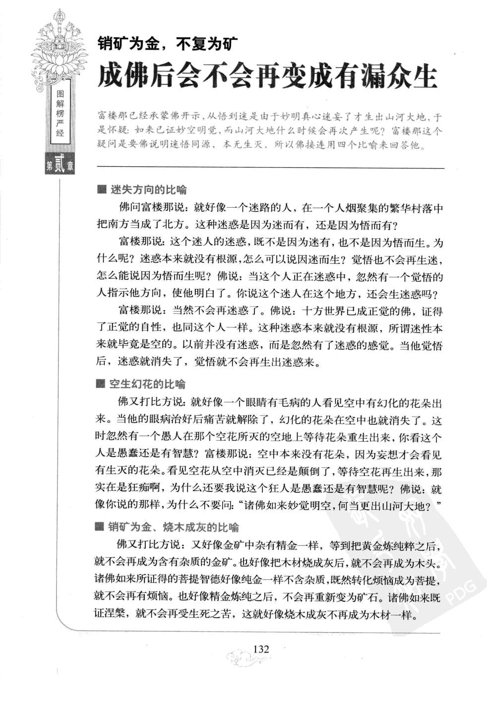富楼那已经承蒙佛开示,从悟到迷是由于妙明真心迷妄了才生出山河大地,于是怀疑:如来已证妙空明觉,而山河天地什么时候会再次产生呢?富楼那这个提问是要佛说明迷悟同源,本无生灭,所以佛接连用四个比喻来回答他。 迷失方向的比喻 佛问富楼那说:就好像一个迷路的人,在一个人烟聚集的繁华村落中把南方当成了北方。这种迷惑是因为迷而有,还是因为悟而有? 富楼那说:这个迷人的迷惑,既不是因为迷有,也不是因为悟而生。为什么呢?迷惑本来就没有根源,怎么可以说因迷而生?觉悟也不会再生迷,怎么能说因为悟而生呢?佛说:当这个人正在迷惑中,忽然有一个觉悟的人指示他方向,使他明白了。你说这个迷人在这个地方,还会生迷惑吗?富楼那说:当然不会再迷感了。佛说:十方世界已成正觉的佛,证得了正觉的自性,也同这个人一样。这种迷惑本来就没有根源,所谓迷性本来就毕竟是空的。以前并没有迷惑,而是忽然有了迷惑的感觉。当他觉悟后,迷惑就消失了,觉悟就不会再生出迷惑来。 空生幻花的比喻 佛又打比方说:就好像一个眼睛有毛病的人看见空中有幻化的花朵出来。当他的眼病治好后痛苦就解除了,幻化的花朵在空中也就消失了。这时忽然有一个愚人在那个空花所灭的空地上等待花朵重生出来,你看这个人是愚蠢还是有智慧?富楼那说:空中本来没有花朵,因为妄想才会看见有生灭的花朵。看见空花从空中消灭已经是颠倒了,等待空花再生出来,那实在是狂痴啊,为什么还要我说这个狂人是愚蠢还是有智慧呢?佛说:就像你说的那样,为什么不要问:“诸佛如来妙觉明空,何当更出山河大地?” 销矿为金、烧木成灰的比喻 佛又打比方说:又好像金矿中杂有精金一样,等到把黄金炼纯粹之后,就不会再成为含有杂质的金矿。也好像把木材烧成灰后,就不会再成为木头。诸佛如来所证得的菩提智德好像纯金一样不含杂质,既然转化烦恼成为菩提,就不会再有烦恼。也好像精金炼纯之后,不会再重新变为矿石。诸佛如来既证涅槃,就不会再受生死之苦,这就好像烧木成灰不再成为木材一样。