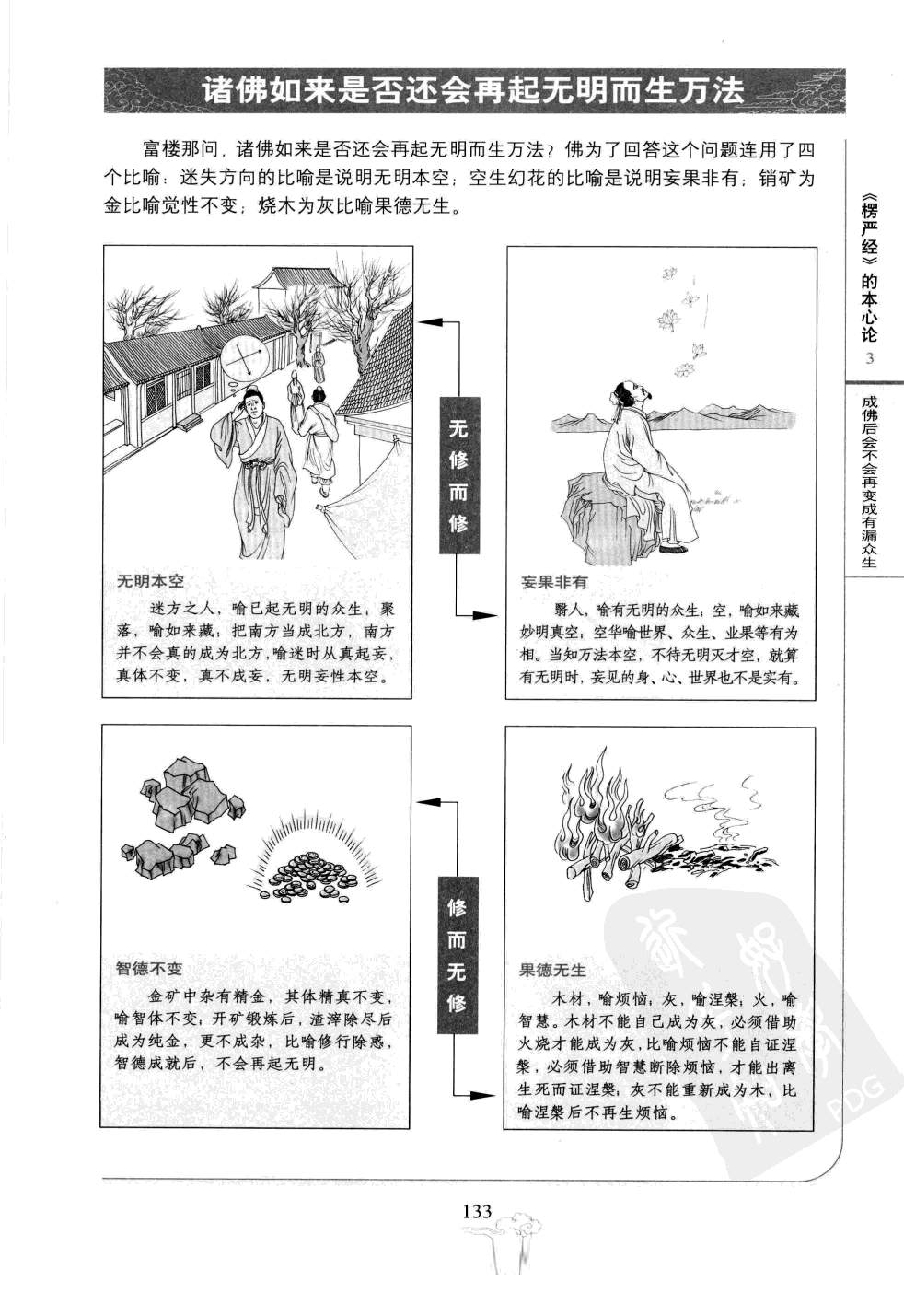 富楼那问,诸佛如来是否还会再起无明而生万法?佛为了回答这个问题连用了四个比喻:迷失方向的比喻是说明无明本空;空生幻花的比喻是说明妄果非有;销矿为金比喻觉性不变;烧木为灰比喻果德无生。 无修而修无明本空 迷方之人,喻已起无明的众生;聚落,喻如来藏;把南方当成北方,南方并不会真的成为北方,喻迷时从真起妄,真体不变,真不成妄,无明妄性本空。 妄果非有 翳人,喻有无明的众生;空,喻如来藏妙明真空;空华喻世界、众生、业果等有为相。当知万法本空,不待无明灭才空,就算有无明时,妄见的身、心、世界也不是实有。 修而无修智德不变 金矿中杂有精金,其体精真不变,喻智体不变;开矿锻炼后,渣滓除尽后成为纯金,更不成杂,比喻修行除惑,智德成就后,不会再起无明。 果德无生 木材,喻烦恼;灰,喻涅槃;火,喻智慧。木材不能自己成灰,必须借助火烧才能成为灰,比喻烦恼不能自证涅槃,必须借助智慧断除烦恼,才能出离生死而证涅槃;灰不能重新成为木,比喻涅槃后不再生烦恼。