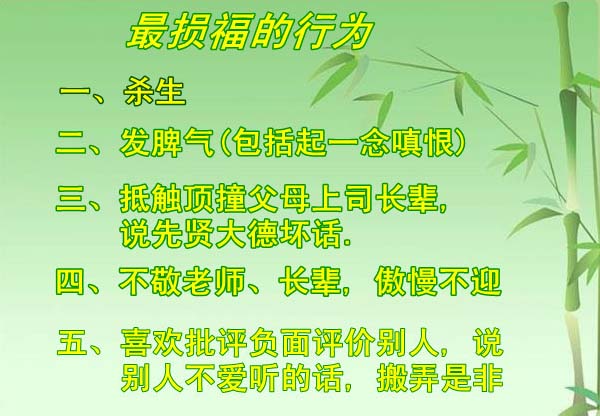 1.杀生。 杀生在一切行为中第一等折福份。买肉吃可以,但不可以买活物杀死做菜,活活煮死一命,削禄二十善。即使虫蚁也不能伤,教育子女小时候不玩杀虫蚁鸟雀,他的福份就不会折损,寿命就不会短缺。杀生的坏处是:短命,工作差,多病,怨气重,贫穷,丑陋。 2.发脾气。 印光大师告诫:女孩子不发脾气,儿女必不夭死,脾气大的女人,生子必多死,或多病。因为一生气,乳即变成毒汁。发大脾气,喂儿立刻即死。稍小点,半天一天方死。发小脾气虽不死,亦必定生病。这是一定不变的事理。 发脾气是一切如来都救不了的。佛经上说“世间之疾莫过猛风,怨念之徵复速于彼,一切如来、金刚天等及五通仙不能救护”,发脾气叫做火烧功德林,一把怒火把一切福德烧尽。对普通人嗔恨发气一次,毁灭一百大劫积累的福德,对父母、长辈、大德、君子发怒,毁灭一千大劫积累的福德。 抵触顶撞父母,嗔恨发气,是福薄命浅的最明显特征,世界上最没有福气的,就是这两种行为。 3.抵触顶撞父母上司长辈,说先贤大德坏话。 抵触顶撞父母是第一等损福败禄的事,无论求什么,必定求不到,万求也枉然,因为积福没有损福快。工作,姻缘,办事不顺,马上反省抵触顶撞父母上司长辈,这是最根本的原因。如果工作不顺,感情痛苦,办事阻碍大,马上软语好物孝顺父母,父母若欢喜,一切天人鬼神都会来护持你。 不抵触父母的人,工作顺利,良缘佳偶。从小不抵触父母师长的人,从小不抵触顶撞父母,就算出身在最贫穷最晦戾的家庭,都会成为出类拔萃的人物。 用钱财供养父母的人,将来必定会富有,孝顺父母但不用钱财物品供养父母,做大官也会缺乏财富。 搜集宣说先贤大德乃至圣贤坏话,一句削禄一百善,败尽一家族血脉的福禄。 4.怨天尤人,搬弄是非,宣扬别人过恶,嫉妒讽刺挖苦他人,脏话骂人。 这些损伤天地的德气和和气,财气全被毁灭,如果没有父祖的资财庇荫,贫穷是一定的,办事不顺。 怨天尤人一次,削禄三善。印光大师说:遇到逆境不怨天尤人,必有后福及子孙兴盛。 别人不好处,要掩藏几分,这是浑厚以养天。养天,才能得天独厚。说是非,是破坏天地的德气,引起鬼神怨憎,诸事不遂。 嫉妒讽刺挖苦人,挖苦别人什么,自己将来就怎样,佛经上有个女人挖苦穷人,她五百生转世贫穷。脏话骂人,比这更糟糕。 若在网络上或者公众场合批评或者宣扬别人过恶,一人听到看到削一禄,百人就削百禄。凡事要针对行为,针对具体的事件,不要针对人来说。 5.炫耀自己。 炫耀自己,在什么地方自满,会招来人天鬼神嫉妒破坏,所以炫耀什么,将来就在什么地方失落。 6.说人坏话,搬弄是非。 说人坏话,这就已经伤了天地间的和气,而招鬼神的降祸。而且,将一些杯弓蛇影,恍惚无凭的谣言加以夸张、添醋,讲得如同目睹一般,使被说的人气愤得忍耐不下,致抑郁难言。他这口怨毒之气历劫难消,岂会没有索报之日?只恐来日刀山剑树有自己的一份。 天地既生发滋润万物的药草,也生发毒害万物的毒草; 天地养育善人君子,也养育小人; 日月从来不是只照耀善人,不照耀恶人的; 海水从来不是只收纳清流,拒绝污流的; 不管我有多少过错缺点,天地日月从来不曾要求我丝毫,所以我不可以要求他人,不可以排挤伤害自己认为的小人、恶人。所谓厚德载物,容不下恶,就不能载物。物,就是生活好,工作好,学习好,姻缘好,人缘好,身体好,一切好。 论语说:泰山不辞土壤,河海不择细流。 联合国秘书长解释这段话说:为人要善于接受所有的人,对于不同的思想、观念和行为要兼收并蓄,才能成就自己。 损福行为: 1.【大慎】爸妈责备发怒,子女生嗔恨是一过,抵触顶撞是十过; 2.工作不竭忠尽力,一事为一过; 3.【大慎】不尊敬先贤和长辈,一日为一过; 4.【大慎】堕胎为二十过; 5.【大慎】心里计划怎样伤害人,有这个念头就一过,如果真的去实施害到了人,就十过; 6.【大慎】杀生,一命一过,大命十过; 7.【大慎】把活的物命丢锅里煮等等残忍方式做菜,害一命二十过; 8.笼子关小动物,一天一过; 9.【大慎】看见别人忧愁,不解释是一过,反而觉得畅快,是二过,说话让别人更忧愁是五过; 10.不要骂斥基督、玉皇大帝、月老、财神、元始天尊等,这些也是诸天正神,一次一过; 11.不100%确定,就说某经是假经,一次十过; 12.念经的时候生气是十过,骂人是二十过,打人是三十过; 13.知道别人的善行,隐藏不说,一次一过; 14.【大慎】知道别人的恶行,宣扬一次是一过; 14.【大慎】刻意搜集先贤的短浅不好的地方,立新说法,一言十过; 15.【慎】出损德之言,一言为十过。如“宁我负人,毋人负我”之类; 16.遇到贤德的人,不向他学习是五过;遇到贤德的朋友不交,是二过;反而说话诋毁和欺负是十过; 17.【大慎】骂平辈或者不认识的网络陌生人,是四过;骂圣贤是一百过;骂君子是十过; 18.给人取外号,五过; 19.吃葱蒜后诵经一卷是一过; 20.【大慎】遇到不顺的事情,怨天尤人一次为三过,不可以怪罪天,不可以怪罪他人。 增长福德的行为: 1.【大赞】隐藏他人的恶行,一次为一善。见到传播人恶的,劝而止之为五善; 2.【大赞】对父母尊敬不顶撞,一日一善; 2.【赞】工作努力,一日一善; 3.【赞】尊敬上司和长辈,一日一善; 4.【大赞】放生,一命一善。小命十命一善,大命十善; 6.把死掉的小动物埋葬,一命为五善; 7.【赞】安慰一次有烦恼忧愁的人一善; 8.米饭喂一下小鸟,蚂蚁,鱼,小虫