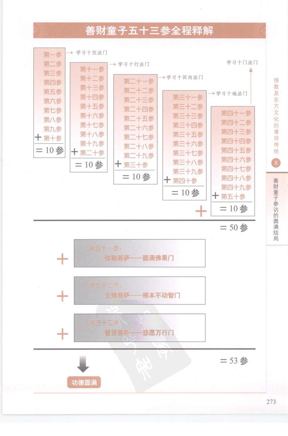 五十三参总结如果说《华严经》中从“十信”到“十地”的修学次第描述还有些抽象,那么《入法界品》中的善财童子则身临其境地经历和体验了菩萨种种十法阶次的修学过程。从世俗生活而言,上至国王,下至富有的长者、良医、海师、童子师,包括妓女等等各种世俗职业者,都是善财童子参访的对象;从宗教修行者而言,上至菩萨,下至比丘、比丘尼、优婆夷、外道苦行者,也都是修行菩萨行者应该虔城学习的。善财童子向诸位善知识请教修行菩萨行以及普贤行的方法,诸位善知识的回答大多数从不同方面解释深化了《华严经》的重要思想和修行法门。通过这一深入法界、随顺法界的全过程,《华严经》的深刻思想无疑更容易深入人心。这也正是《入法界品》千百年来赢得佛教信众无限敬仰的原因。