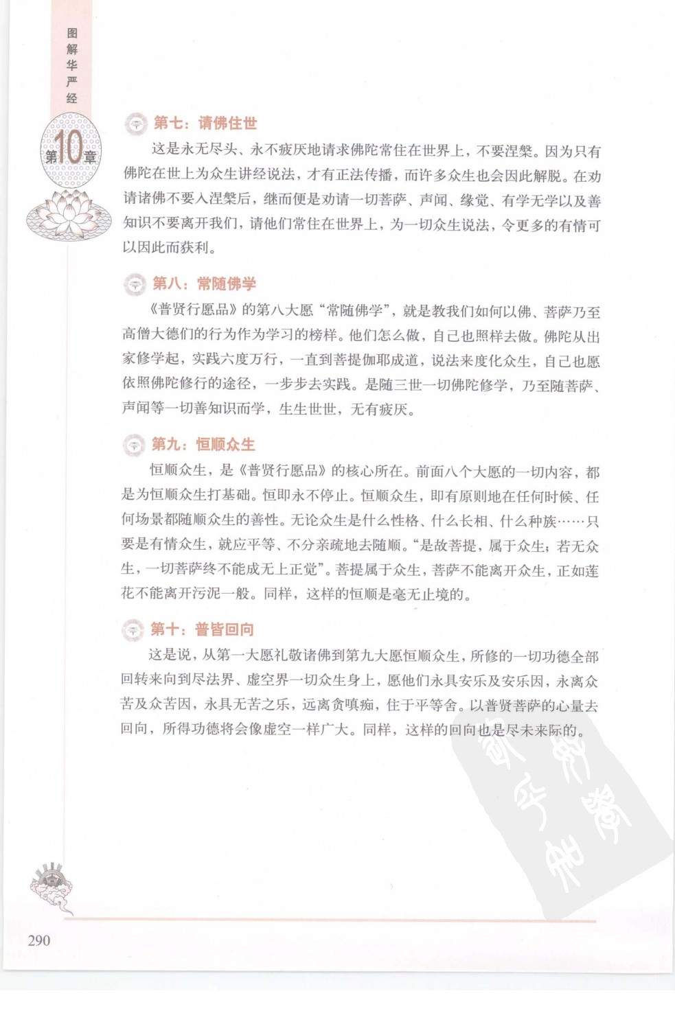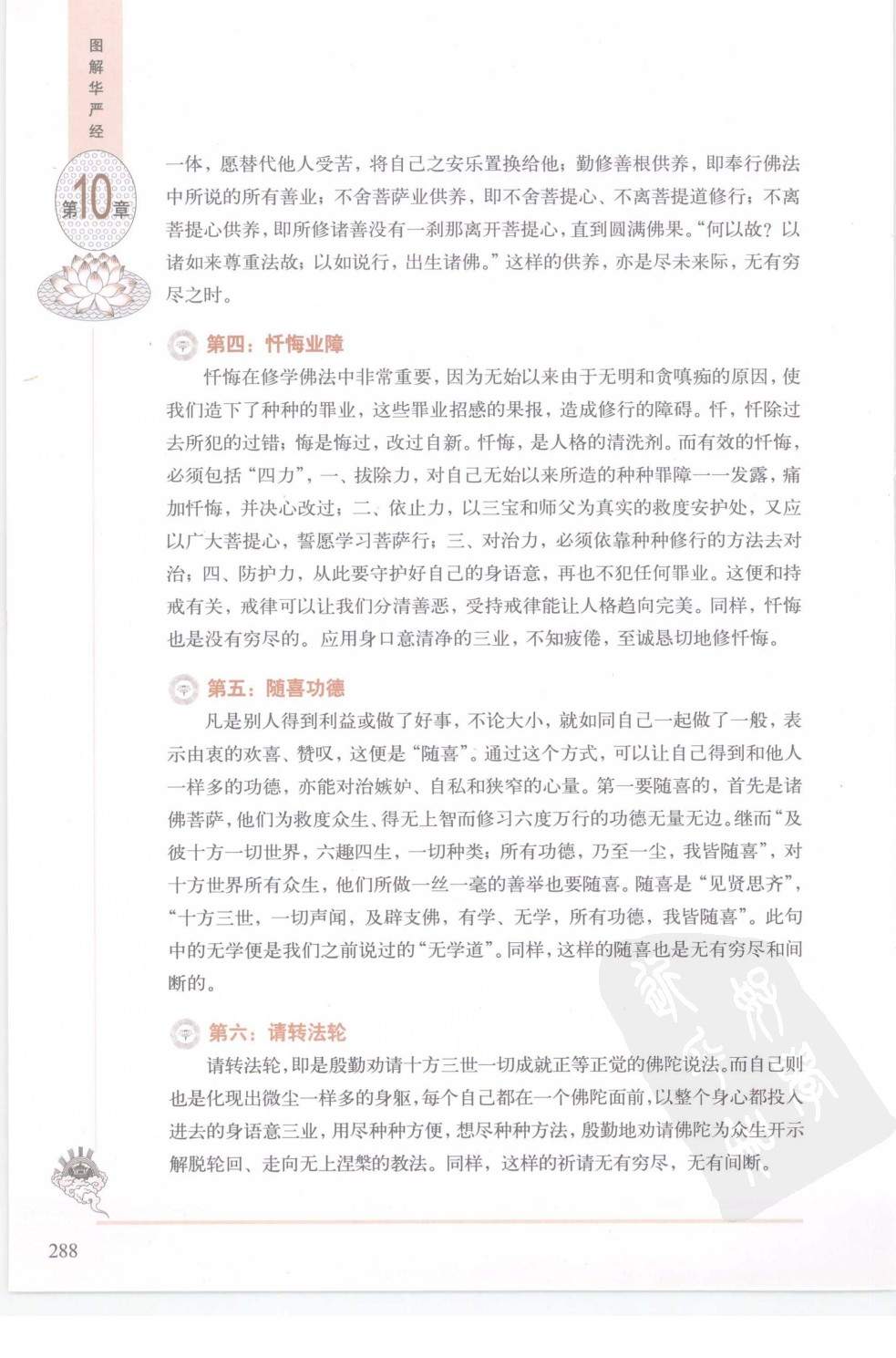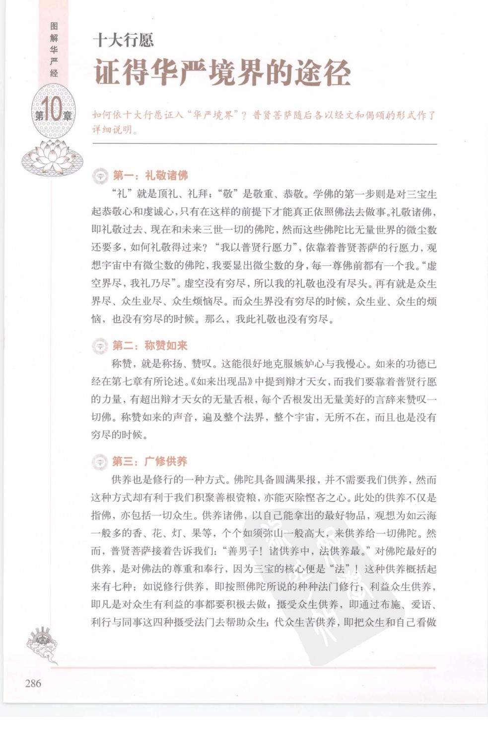 如何依十大行愿证入“华严境界”?普贤菩萨随后各以经文和偈颂的形式作了详细说明。 “礼”就是顶礼、礼拜;“敬”是敬重、恭敬。学佛的第一步则是对三宝生起恭敬心和虔诚心,只有在这样的前提下才能真正依照佛法去做事。礼敬诸佛,即礼敬过去、现在和未来三世一切的佛陀,然而这些佛陀比无量世界的微尘数还要多,如何礼敬得过来?“我以普贤行愿力”,依靠着普贤菩萨的行愿力,观想宇宙中有微尘数的佛陀,我要显出微尘数的身,每一尊佛前都有一个我。“虚空界尽,我礼乃尽”。虚空没有穷尽,所以我的礼敬也没有尽头。再有就是众生界尽、众生业尽、众生烦恼尽。而众生界没有穷尽的时候,众生业、众生的烦恼,也没有穷尽的时候。那么,我此礼敬也没有穷尽。 称赞,就是称扬、赞叹。这能很好地克服嫉妒心与我慢心。如来的功德已经在第七章有所论述。《如来出现品》中提到辩才天女,而我们要靠着普贤行愿的力量,有超出辩才天女的无量舌根,每个舌根发出无量美好的言辞来赞叹一切佛。称赞如来的声音,遍及整个法界,整个宇宙,无所不在,而且也是没有穷尽的时候。 供养也是修行的一种方式。佛陀具备圆满果报,并不需要我们供养,然而这种方式却有利于我们积聚善根资粮,亦能灭除悭吝之心。此处的供养不仅是指佛,亦包括一切众生。供养诸佛,以自己能拿出的最好物品,观想为如云海一般多的香、花、灯、果等,个个如须弥山一般高大,来供养给一切佛陀。然而,普贤菩萨接着告诉我们:“善男子!诸供养中,法供养最。”对佛陀最好的供养,是对佛法的尊重和奉行,因为三宝的核心便是“法”!这种供养概括起来有七种:如说修行供养,即按照佛陀所说的种种法门修行;利益众生供养,即凡是对众生有利益的事都要积极去做;摄受众生供养,即通过布施、爱语、利行与同事这四种摄受法门去帮助众生;代众生苦供养,即把众生和自己看做一体,愿替代他人受苦,将自己之安乐置换给他;勤修善根供养,即奉行佛法中所说的所有善业;不舍菩萨业供养,即不舍菩提心、不离菩提道修行;不离菩提心供养,即所修诸善没有一刹那离开菩提心,直到圆满佛果。“何以故?以诸如来尊重法故;以如说行,出生诸佛”。这样的供养,亦是尽未来际,无有穷尽之时。 忏悔在修学佛法中非常重要,因为无始以来由于无明和贪嗔痴的原因.使我们造下了种种的罪业,这些罪业招感的果报,造成修行的障碍。忏,忏除过去所犯的过错;悔是悔过,改过自新。忏悔,是人格的清洗剂。而有效的忏悔,必须包括“四力”:一、拔除力,对自己无始以来所造的种种罪障一一发露,痛加忏悔,并决心改过;二、依止力,以三宝和师父为真实的救度安护处,又应以广大菩提心,誓愿学习菩萨行;三、对治力,必须依靠种种修行的方法去对治;四、防护力,从此要守护好自己的身语意,再也不犯任何罪业。这便和持戒有关,戒律可以让我们分清善恶,受持戒律能让人格趋向完美。同样,忏悔也是没有穷尽的。应用身口意清净的三业,不知疲倦,至诚恳切地修忏悔。 凡是别人得到利益或做了好事,不论大小,就如同自己一起做了一般,表示由衷的欢喜、赞叹,这便是“随喜”。通过这个方式,可以让自己得到和他人一样多的功德,亦能对治嫉妒、自私和狭窄的心量。第一要随喜的,首先是诸佛菩萨,他们为救度众生、得无上智而修习六度万行的功德无量无边。继而“及彼十方一切世界,六趣四生,一切种类,所有功德,乃至一尘,我皆随喜”,对十方世界所有众生,他们所做一丝一毫的善举也要随喜。随喜是“见贤思齐”,“十方三世,一切声闻,及辟支佛,有学、无学,所有功德,我皆随喜”。此句中的无学便是我们之前说过的“无学道”。同样,这样的随喜也是无有穷尽和间断的。 请转法轮,即是殷勤劝请十方三世一切成就正等正觉的佛陀说法。而自己则也是化现出微尘一样多的身躯,每个自己都在一个佛陀面前,以整个身心都投入进去的身语意三业,用尽种种方便,想尽种种方法,殷勤地劝请佛陀为众生开示解脱轮回、走向无上涅槃的教法。同样,这样的祈请无有穷尽,无有间断。 这是永无尽头、永不疲厌地请求佛陀常住在世界上,不要涅槃。因为只有佛陀在世上为众生讲经说法,才有正法传播,而许多众生也会因此解脱。在劝请诸佛不要入涅槃后,继而便是劝请一切菩萨、声闻、缘觉、有学无学以及善知识不要离开我们,请他们常住在世界上,为一切众生说法,令更多的有情可以因此而获利。 《普贤行愿品》的第八大愿“常随佛学”,就是教我们如何以佛、菩萨乃至高僧大德们的行为作为学习的榜样。他们怎么做,自己也照样去做。佛陀从出家修学起,实践六度万行,一直到菩提伽耶成道,说法来度化众生,自己也愿依照佛陀修行的途径,一步步去实践。是随三世一切佛陀修学,乃至随菩萨、声闻等一切善知识而学,生生世世,无有疲厌。 恒顺众生,是《普贤行愿品》的核心所在。前面八个大愿的一切内容,都是为恒顺众生打基础。恒即永不停止。恒顺众生,即有原则地在任何时候、任何场景都随顺众生的善性。无论众生是什么性格、什么长相、什么种族……只要是有情众生,就应平等、不分亲疏地去随顺。“是故菩提,属于众生,若无众生,一切菩萨终不能成无上正觉”。菩提属于众生,菩萨不能离开众生,正如莲花不能离开污泥一般。同样,这