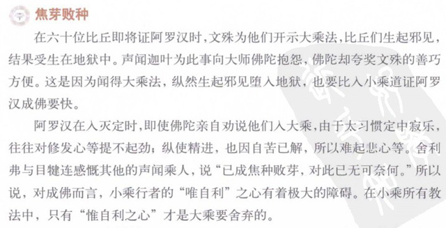 在六十位比丘即将证阿罗汉时,文殊为他们开示大乘法,比丘们生起邪见,结果受生在地狱中。声闻迦叶为此事向大师佛陀抱怨,佛陀却夸奖文殊的善巧方便。这是因为闻得大乘法,纵然生起邪见堕入地狱,也要比入小乘道证阿罗汉成佛要快。 阿罗汉在入灭定时,即使佛陀亲自劝说他们入大乘,由于太习惯定中寂乐,往往对修发心等提不起劲;纵使精进,也因自苦已解,所以难起悲心等。舍利弗与目犍连感慨其他的声闻乘人,说“已成焦种败芽,对此已无可奈何。”所以说,对成佛而言,小乘行者的“唯自利”之心有着极大的障碍。在小乘所有教法中,只有“惟自利之心”才是大乘要舍弃的。 上传日期:2013.10.31 东方阳熹按: 因为小乘行者的“自利之心”含有“我执”、“我所”、“有为”、以及对“觉受”的执著,所以无法成佛——获得究竟的觉悟和解脱。