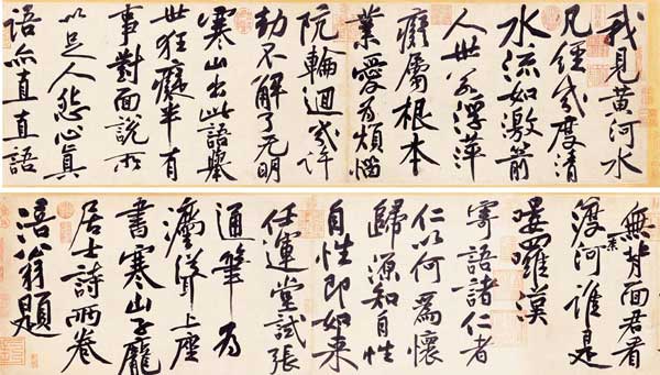 黄庭坚 (1045-1105),字鲁直,自号山谷道人,晚号涪翁,又称黄豫章,洪州分宁(今江西修水)人。北宋诗人、词人、书法家,为盛极一时的江西诗派开山之祖。英宗治平四年(1067)进士。历官叶县尉、北京国子监教授、校书郎、著作佐郎、秘书丞、涪州别驾、黔州安置等。哲宗立,召为校书郎、《神宗实录》 检讨官。后擢起居舍人。绍圣初,新党谓其修史“多诬”,贬涪州别驾,安置黔州等地。徽宗初,羁管宜州卒。宋英宗治平四年进士,绍圣初以校书郎坐修《神宗实录》失实被贬职,后来新党执政,屡遭贬,死于宜州贬所。 寒山(约691-793) 寒山子乃唐代首都长安人,出身于官宦人家,多次投考不第,被迫出家,三十岁后隐居于浙东天台山,享年一百多岁。严振非《寒山子身世考》中更以《北史》、《隋书》等大量史料与寒山诗相印证,指出寒山乃为隋皇室后裔杨瓒之子杨温,因遭皇室内的妒忌与排挤及佛教思想影响而遁入空门,隐于天台山寒岩。这位富有神话色彩的唐代诗人,曾经一度被世人冷落,然而随着二十世纪的到来,其诗却越来越多地被世人接受并广泛流传。正如其诗所写:“有人笑我诗,我诗合典雅。不烦郑氏笺,岂用毛公解。” 上传日期:2013.11.26