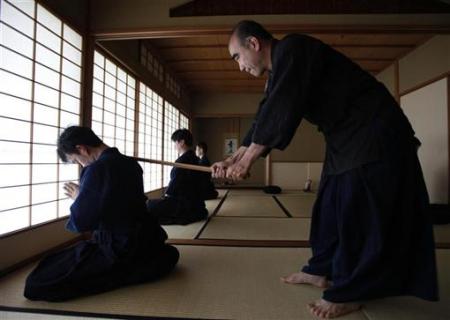 日本松下政经塾由松下电器创办人松下幸之助于1979年所创办,为日本培养新国家所需的人才。在培训课程中,禅修也是重要的一环,以锻炼专注清明的思考。在茅崎市的训练中心里,塾主任古山和宏使用香板,拍打塾生的肩膀。打香板是禅坐时用来提醒禅坐者保持清醒的一个方法。(图文/路透)
