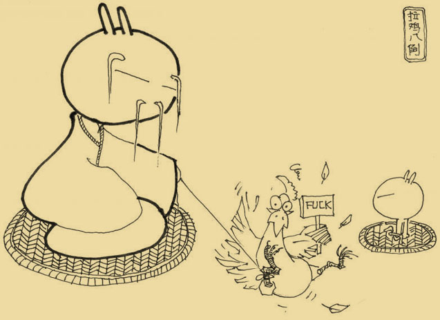 禅师笑而不语,抓来一只鸡,在鸡腿上缠了根线,他一拉线,鸡立即跌倒,挣扎起来继续走,禅师又一拉,鸡又倒,如此反复八次。