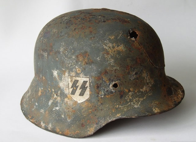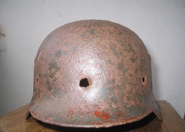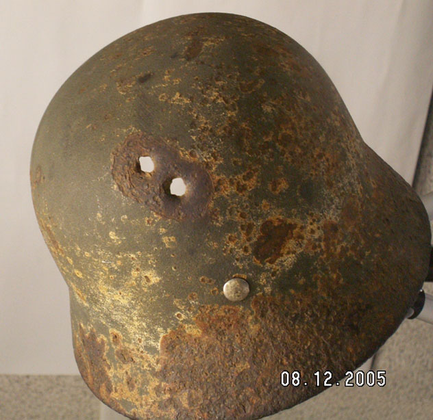 这顶头盔也是俄罗斯某私人收藏家的藏品。头盔是从地下挖出来的,表面同样有弹孔。虽然其质量比通常见到的德军头盔更低劣,但可以保证它是真品。说这句话的原因在于,波兰人伪造二战头盔已经很久了(自60年代开始)。