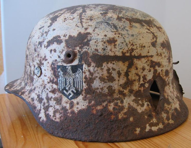 这是一顶冬季使用的头盔,白油漆是德军士兵自己涂上去的,因为他们根本没想到还要在白雪皑皑的严冬季节里作战。(译注:希特勒本打算在莫斯科过圣诞节)