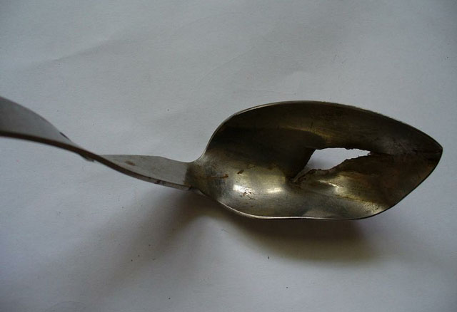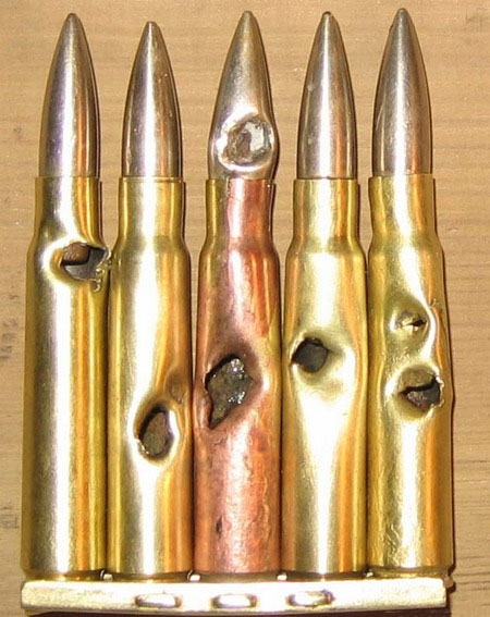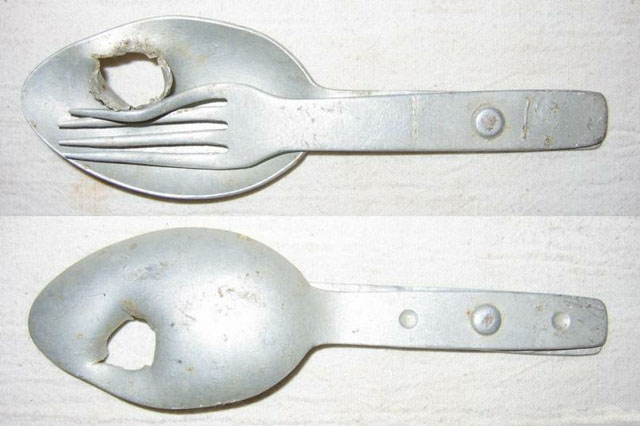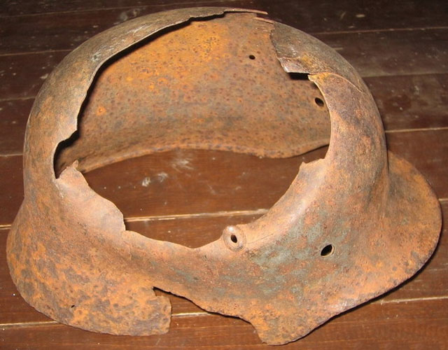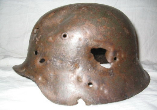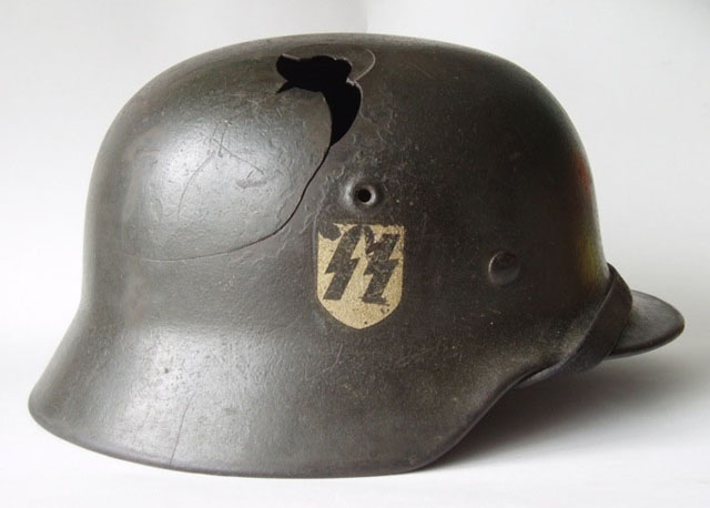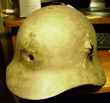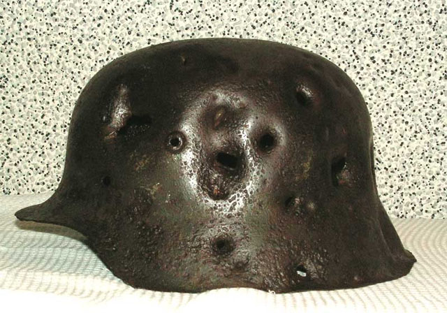 这顶头盔上有一个弹孔。虽然头盔能够保护人的脑袋,但只有当弹片击中并划过头盔表面时才有效。(译注:头盔的主要用途是防破片,而非抵挡步枪弹直射)