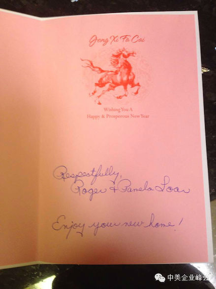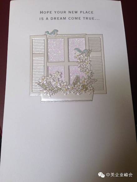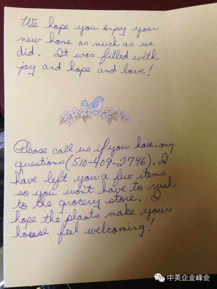 推开门后屋里的情景让我们呆住了——完全没有我们想象的脏乱的情景。地毯一尘不染,地板甚至闪着光泽;房间没有一丝杂物、纸屑。再看墙上我们竟然发现原来墙上挂画用的钉子洞被填平了!再伸手开灯时灯是亮的,伸手开水时水是流的——这说明原房主没有断水断电,这会使他们承担一定风险和多付一些水电费,但这给新来的人带来了巨大的便利——后来人少了很多重新申请的麻烦,只需在水电局更换姓名即可。 走进厨房让我们更看到了这样的景象—— 炉台干干净净,清洁如洗,旁边堆放着一批全新的用品:擦手纸、卫生纸、纸杯、纸盘,抹布(全新没使用过的抹布)。上面有一个白信封,写着“祝贺——希望你的新家是你梦想成真。” 这堆物品中还有一个紫红色塑料夹子,夹子当中竟然是原主人留给我们的洗衣机,烘干机,洗碗机和微波炉的完整的说明书。 炉台的另一边是一盆鲜花和一盆绿植。我的天呢!——还有一个印着飞马的带着中文字“骏马扬蹄驰万里,鸿福常满年有余”的新年贺卡!