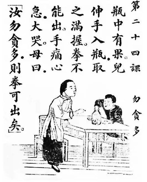 《勿贪多》,民国《共和国教科书新国文》第三册中的第二十四课,全文仅34个字:瓶中有果。儿伸手入瓶,取之满握。拳不能出,手痛心急,大哭。母曰:“汝勿贪多,则拳可出矣”。 意思是,瓶子里有糖果,孩子伸手去瓶子里取,抓了一大把,瓶口小,手无法出来,硬出手疼,心急大哭。母亲说:“你不要贪多,少拿几个手就可以出来了。” 文章虽小,却蕴含着丰富的人生哲理。 “勿贪多”是从小就要养成的道德约束底线。 我们大人都知道,贪念是生命痛苦的根源,小孩子不懂这些,只知道拿自己喜欢的东西,并且是想要一次拿完。自幼父母就告诉我们,一个一个往嘴里填,不要一次塞满,小心噎着。不是自己的东西,不能拿,这是规矩。吃东西时,慢点吃,少吃滋味好,多吃滋味少。 如果童年时大人能教授我们这个道理,是会受用一生的。勿贪多,教会了我们节制与取舍,从思考和判断上划定了贪婪的底线。 在我们大人的世界里,大多数都知道贪多嚼不烂这个道理。但是很多人并没有自幼从思想上形成道德准则,当我们长大后,面对花花世界、灯红酒绿、财富、权力、美女、帅哥,在选择的时候就没有这样一个门槛底线制约自己的判断,贪欲熏心,迷失了自我。 这么一个很浅显的道理,很多人就是没有做到,是因为自小缺少“勿贪多”的实践教学,如果自小将“勿贪多”的道理升入到我们的灵魂中,生活便就有了底线,人生便就有了敬畏。