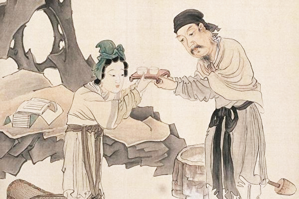 中国传统文化非常重视夫妻道德,儒家把夫妻关系列为「三纲」之一,认为夫妻关系本于天地之德,它直接影响家庭的和谐、社会的安定和风教的淳朴。儒家认为夫妻之间应该夫义妇顺、夫和妻柔。此外,夫妻之间也不仅是卿卿我我,而需患难与共,相互砥砺,这是传统夫妻关系之精华所在。 东汉文学家梁鸿虽然家贫但很有道德操守,所以上门说媒提亲的人很多,但都被他婉拒了。同县一个叫孟光的女子年已三十,仍然挑挑拣拣不肯出嫁,父母问她原因,她说:「要嫁就嫁梁鸿那样贤达的人。」梁鸿听说之后就迎娶了她。 孟光过门之后,就将家里内外装饰一新。而梁鸿却接连七天都不搭理她。她于是问梁鸿:「我听说您品行高洁,拒绝过很多求婚的人。如今我有幸被您看中,却不知我做错了什么事,使您从不正眼看我?」 梁鸿说:「我想要娶的妻子,是能够穿着粗布衣服,和我一起隐居山中的人。如今妳穿着华丽的绢织衣服,涂脂抹粉,并非如我所愿,所以才会冷落妳。」 孟光恍然大悟,说:「原来这是您的志向,我已备好隐居之服。」于是换上布衣荆钗来见梁鸿。 梁鸿见了高兴的说:「这才是我的妻子。」不久,两人迁入霸陵山中,以耕织为业,每日颂读《诗经》、《尚书》,弹琴自娱,过的很快乐。 后来夫妻两人又迁到吴地。每次梁鸿从外面回到家中,孟光给他做好饭,将盛饭的托盘举到同她眼眉一样高的地方。人们称赞他们夫妻两人:「这对夫妇真是举案齐眉、相敬如宾啊!」