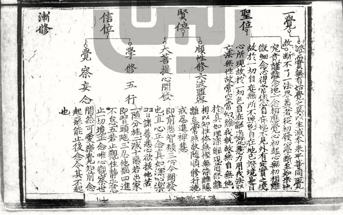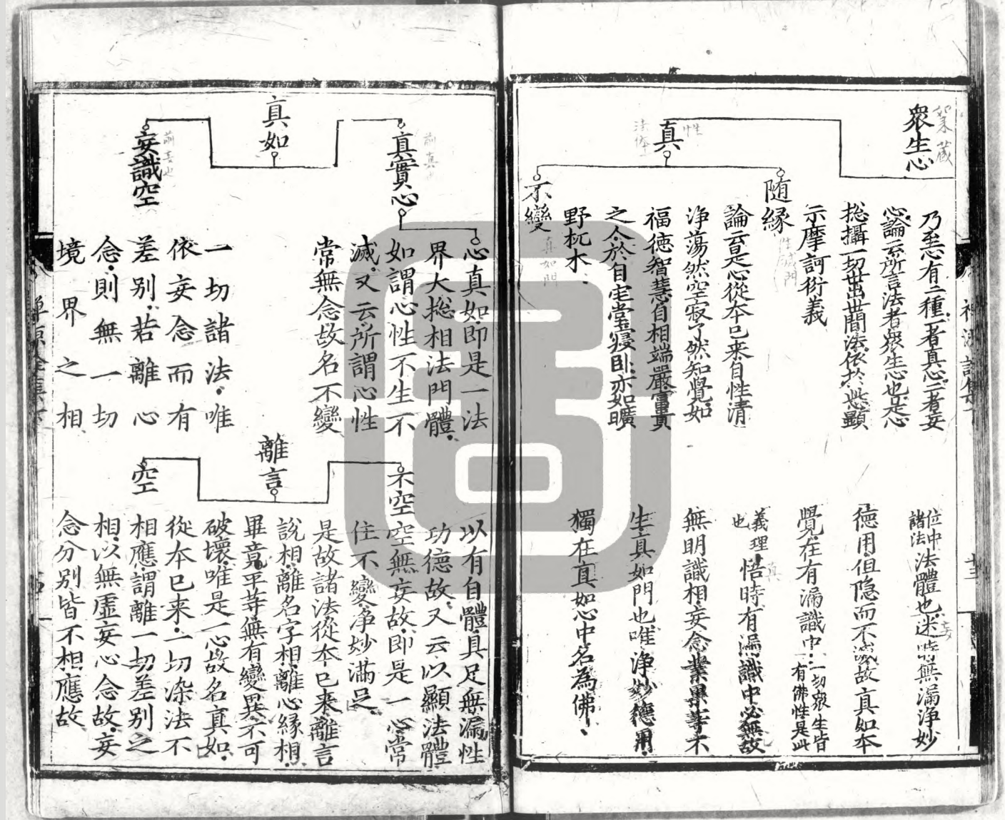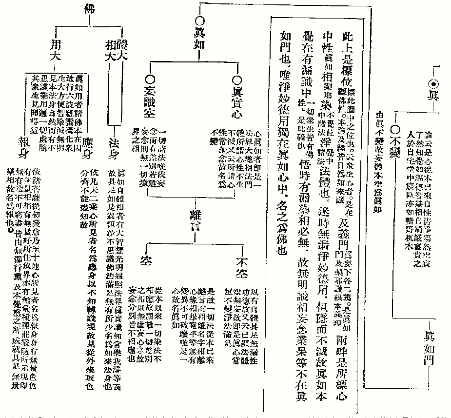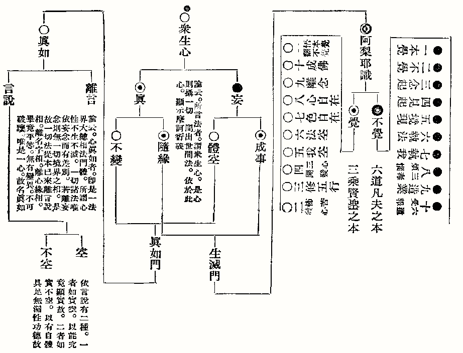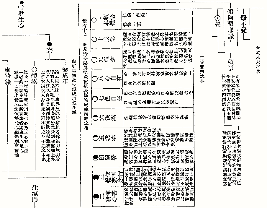 详究前述谛观此图。对勘自他及想贤圣。为同为异。为真为妄。我在何门。佛在何位。为当别体。为复同源。即自然不执着于凡夫。不僣滥于圣位。不耽滞于爱见。不推让于佛心也。然初十重是一藏经所治法身中(第一重)烦恼之病生起元由(次三重)。渐渐加增(我法二执)。乃至粗重(三毒造业)慧灭(受报)之状。后十重是法身信方服药(前三重汗出)汗出病差(菩提心开发)。将理方法(六波罗蜜)。渐渐减退(从六至九)。乃至平复(成佛)之状。如有一人(在缠法身)诸根具足(恒沙功德)。强壮(常住不变妄不能染)多艺(恒沙妙用)。忽然得病(无始无明)。渐渐加增(其次七重)。乃至气绝(第十重)。唯心头暖(赖耶识中无漏智种)。忽遇良医(大善知识)。知其命在(见凡夫人即心是佛)。强灌神药(初闻不信频就不舍)。忽然苏醒(悟解)。初未能言(初悟之人未能说法答他问难皆悉未得)。乃至渐语(能说法也)。渐能行履(十地十波罗蜜)。直至平复(成佛)。所解伎艺无所不为(神通光明一切种智)。以法一一对合。何有疑而不除也。即知一切众生不能神变作用者。但以业识惑病所拘。非己法身不具妙德。今愚者难云。汝既顿悟即佛。何不放光者。何殊令病未平复之人。便作身上本艺。然世医处方必先候脉。若不对病状轻重。何辨方书是非。若不约痊愈浅深。何论将理法则。法医亦尔。故今具述迷悟各十重之本末。将前经论统三种之浅深。相对照之如指其掌。劝诸学者。善自安心。行即任随寄一门解。即须通达无碍。又不得虑其偏局。便[漭-廾+卉]荡无所指归。须洞鉴源流。令分菽麦。必使同中见异异处而同。镜像千差。莫执好丑。镜明一相。莫忌青黄。千器一金虽无阻隔。一珠千影元不混和。建志运心等虚空界。防非察念在毫厘间。见色闻声。自思如影响否。动身举意。自料为佛法否。美膳粝餐。自想无嫌爱否。炎凉冻暖。自看免避就否。乃至利衰毁誉称讥苦乐。一一审自反照实得情意一种否。必若自料未得如此。即色未似影。声未似响也。设实顿悟终须渐修。莫如贫穷人终日数他宝自无半钱分。六祖大师云。佛说一切法。为度一切心。我无一切心。何须一切法。今时人但将此语轻于听学。都不自观实无心否。若无心者。八风不能动也。设习气未尽。嗔念任运起时。无打骂仇他心。贪念任运起时。无营求令得心。见他荣盛时。无嫉妒求胜心。一切时中于自己无忧饥冻心。无恐人轻贱心。乃至种种此等亦得名为无一切心也。此名修道。若得对违顺等境。都无贪嗔爱恶。此名得道。各各反照。有病即治。无病勿药。问贪嗔等即空便名无一切心。何必对治。答若尔汝今忽遭重病痛苦。痛苦即空。便名无病。何必药治。须知贪嗔空而能发业。业亦空而能招苦。苦亦空只么难忍。故前图中云。体空成事(如杌木上鬼全空。只么惊人。得奔走倒地。头破额裂)。若以业即空。空只么造业。即须知地狱烧煮痛楚亦空。空只么楚痛。若云亦任楚痛者。即现今设有人以火烧刀斫。汝何得不任。今观学道者。闻一句违情语犹不能任。岂肯任烧斫乎(如此者十中有九也)。问上来所叙三种教三宗禅。十所以十别异轮回及修证。又各十重理无不穷事无不备。研寻玩味足可修心。何必更读藏经及集诸禅偈数过百卷。答众生惑病各各不同。数等尘沙。何唯八万。诸圣方便有无量门。一心性相有无量义。上来所述但是提纲。虽统之不出所陈。而用之千变万势。况先哲后俊各有所长。古圣今贤各有所利。故集诸家之善记。其宗徒有不安者亦不改易。但遗阙意义者注而圆之。文字繁重者注而辨之。仍于每一家之首注评大意。提纲意在张网。不可去网存纲(华严云。张大教网。漉人天鱼。置涅槃岸)。举领意在着衣。不可弃衣取领。若但集而不叙。如无纲之网。若但叙而不集。如无网之纲。思而悉之不烦设难。然克己独善之辈。不必遍寻。若欲为人之师。直须备通本末。好学之士披阅之时。必须一一详之。是何宗何教之义。用之不错皆成妙药。用之差互皆成反恶。然结集次第不易排伦。据入道方便即合。先开本心。次通理事。次赞法胜妙呵世过患。次劝诫修习。后示以对治方便渐次门户。今欲依此编之。乃觉师资昭穆颠倒交不稳便。且如六代之后。多述一真。达摩大师却教四行。不可孙为部首。祖为末篇。数日之中思惟此事。欲将达摩宗枝之外为首。又以彼诸家所教之禅。所述之理。非代代可师。通方之常道。或因以彼修炼功至证得。即以之示人(求那慧稠卧轮之类)。或因听读圣教生解。即以之摄众(慧闻禅师之类)。或降其迹而适性。一时间警策群迷(志公傅大士王梵志之类)。或高其节而守法。一国中轨范僧侣(庐山远公之类)其所制作。或咏歌至道。或嗟叹迷凡。或但释义。或唯励行。或笼罗诸教。竟不指南。或偏赞一门。事不通众。虽皆禅门影响佛法笙簧。若始终依之为释迦法。即未可也(天台言教广本虽备有始终又不在此集之内)。以心传嗣。唯达摩宗。心是法源。何法不备。所修禅行似局一门。所传心宗实通三学。况覆寻其始(始者迦叶阿难)。亲禀释迦。代代相承。一一面授。三十七世(有云。西国已有二十八祖者。下祖传序中。即具分析)至于吾师(缅思何幸得为释迦三十八代嫡孙也)。故今所集之次者先录达摩一宗。次编诸家杂述。后写印一宗圣