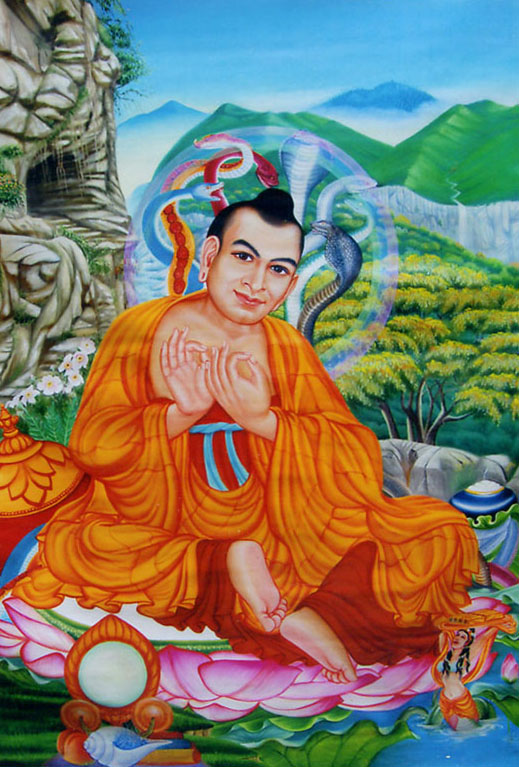 龙树菩萨者,出南天竺梵志种也。天聪奇悟,事不再告。在乳哺之中,闻诸梵志诵《四韦陀典》,各四万偈,偈有三十二字,背诵其文,而领其义。弱冠驰名,独步诸国,世学艺能、天文地理、图纬秘谶,及诸道术,无不悉练。 契友三人,亦是一时之杰。相与议曰:“天下义理,可以开神明、悟幽旨者,吾等尽之矣。复欲何以自娱?骋情极欲,最是一生之乐。然诸梵志道士,势非王公,何由得之?唯有隐身之术,斯乐可办。”四人相视,莫逆于心,俱至术家求隐身法。术师念曰:“此四梵志,擅名一世,草芥群生。今以术故,屈辱就我。我若咒法授之,此人才明绝世,所不知者唯此贱法,若得之便去,不复可屈。且与其药,使日用而不知,药尽必来求,可以术屈为我弟子。”各与青药一丸,告之曰:“汝于静处,用水磨之,以涂眼睑,则无有人能见汝形者。”龙树菩萨磨药闻气,便尽知药名、分数多少,锱铢无失。还语术师,此药有七十种,分数多少,尽如其方。药师问曰:“汝何由知?”答曰:“药自有气,何以不知?”师即叹伏:“若斯人者,闻之犹难,而况相遇?我之贱术,何足惜耶!”即具授。 其四人得术,隐身自在,入王宫中。宫中美人,皆被侵陵。百余日后,宫中人有怀妊者,以事白王。王大不悦:“此何不祥,为怪乃尔?”召诸智臣,以谋此事。有旧老者言:“凡如此事,应有二种,或是鬼魅,或是方术。可以细土置诸门中,令有司守之,断诸行者。若是术人,足迹自现,可以兵除。若是鬼魅,则无迹也。鬼可咒除,人可刀杀。”备法试之,见四人迹。即闭诸门,令数百力士挥刀空斫,斫杀三人。唯有龙树,敛身屏气,依王头侧。王头侧七尺,刀所不至。是时始悟欲为苦本,众祸之根,败德危身,皆由此起。即自誓曰:“若我得脱,当诣沙门,受出家法。” 既出入山,诣一佛塔,出家受戒。九十日中诵三藏尽,通诸深义。更求异经,都无得处。遂入雪山,山中深远处有佛塔,塔中有一老比丘,以摩诃衍经与之。诵受爱乐,虽知实义,未得通利。周游诸国,更求余经。于阎浮提中,遍求不得。外道论师、沙门义宗,咸皆摧伏。即起骄慢,心自念言:“世界法中,津途甚多。佛经虽妙,以理推之,故有未尽。未尽之中,可推而演之,以悟后学。于理不违,于事无失,斯有何咎?”思此事已,即欲行之。立师教诫,更造衣服,令附佛法,而有小异。方欲以无所推屈,表一切智相。择日选时,当与诸弟子受新戒、着新衣,便欲行之。独在静室,水精地房。 大龙菩萨见其如此,惜而愍之,即接入海。于宫殿中开七宝藏,发七宝函,以诸方等深奥经典,无量妙法,授之龙树。龙树受读,九十日中,通解甚多,其心深入,体得实利。龙知其心,而问之曰:“看经遍未?”答言:“汝诸函中经,甚多无量,不可尽也。我所读者,已十倍阎浮提。”龙言:“如我宫中所有经典,诸处此比,复不可知。”龙树即得诸经一相,深入无生,三忍具足。龙还送出。 时南天竺王甚邪见,承事外道,毁谤正法。龙树菩萨为化彼故,躬持赤幡,在王前行,经历七年。王始怪问:“此是何人,在吾前行?”答曰:“我是一切智人。”王闻是已,甚大惊愕,而问之言:“一切智人,旷代不有。汝自言是,何以验之?”答言:“欲知智在说,王当见问。”王即自念:“我为智主,大论议师。问之能屈,犹不足名。一旦不如,此非小事。若其不问,便是一屈。”迟疑良久,不得已而问之:“天今何为耶?”龙树言:“天今与阿修罗战。”王闻此言,譬如人噎,既不得吐,又不得咽。欲非其言,复无以证之。欲是其事,无事可明。未言之间,龙树复言:“此非虚论求胜之谈。王小待之,须臾有验。”言讫,空中便有干戈兵器,相系而落。王言:“干戈矛戟,虽是战器,汝何必知是天与阿修罗战?”龙树言:“构之虚言,不如校以实事。”言已,阿修罗手、足、指及其耳、鼻,从空而下。又令王及臣民、婆罗门众,见空中清除,两阵相对。王乃稽首,伏其法化。殿上有万婆罗门,皆弃束发,受成就戒。 是时龙树于南天竺大弘佛教,摧伏外道,广明摩诃衍。作《优波提舍》十万偈,又作《庄严佛道论》五千偈、《大慈方便论》五千偈,令摩诃衍教大行于天竺。又造《无畏论》十万偈,于《无畏》中出《中论》也。 时有婆罗门,善知咒术,欲以所能与龙树诤胜,告天竺国王:“我能伏此比丘,王当验之。”王言:“汝大愚人。此菩萨者,明与日月争光,智与圣心并照。汝何不逊,敢不推敬?”婆罗门言:“王为智人,何不以理验之,而抑断一切?”王见言至,为请龙树,清旦共坐政德殿上。婆罗门后至,便于殿前,咒作大池,广长清净。中有千叶莲华,自坐其上,而诃龙树:“汝在地坐,如畜生无异,而欲与我清净华上大德智人抗言论议?”尔时龙树亦以咒术,化作六牙白象,行池水上,趣其华座,以鼻绞拔,高举掷地。婆罗门伤腰委顿,归命龙树:“我不自量,毁辱大师。愿哀受我,启其愚蒙。” 有一小乘法师,常怀忿嫉。龙树问之言:“汝乐我久住世否?”答言:“实不愿也。”退入闲室,经日不出。弟子破户看之,遂蝉蜕而去。去世已来始过百岁,南天竺诸国为其立庙,敬奉如佛。其母树下生之,因字“阿周陀那”。阿周陀那,树名也。以龙成其道,故以“龙”配字,号曰“龙树”也。(依《付法藏传》,即第十三祖师也。假饵仙药,现住长寿二百余年,住持佛法。其所度人,不可称数。)