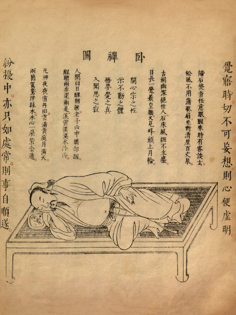 开心宗之性,示不动之体; 觉寤时,切不可妄想,则心便虚明; 扫石焚香在意眠,醒来时有客谈玄; 古洞幽深绝世人,石床风细不生尘; 人间白日醒犹睡,老子山中睡且醒; 元神夜夜宿丹田,云满黄庭月满天;