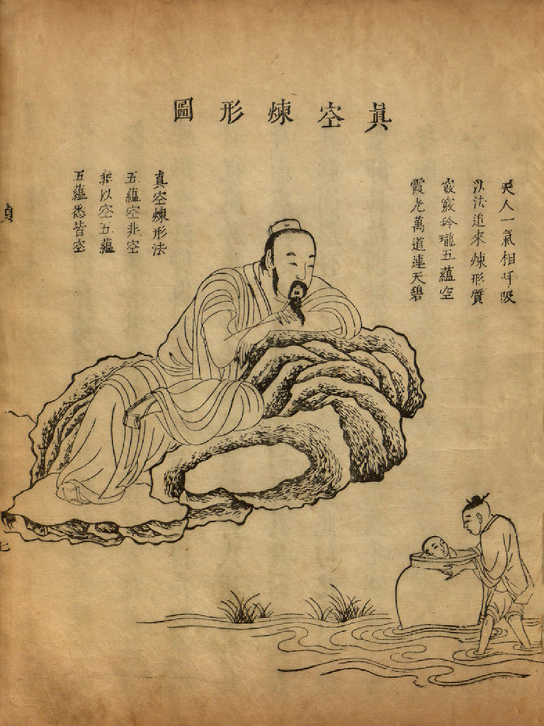 普照怫心曰:异端有白我其观,却叹人从瓮里盘。最上一乘含蓄远,好从玄窍觅天宽。 盖真空炼形之法,譬喻运瓮相似。若处瓮内,焉能运之,必也处于瓮外。身处瓮外者,即释氏所谓外其身而虚空之是也。 故老子曰:外其身而身修,忘其形而形存。 薛道光曰:若人空此幻化身,亲授圣师真规则。 张全一曰:太虚是我,先空其身。其身既空,天地亦空。天地既空,太空亦空。空无所空,乃是真空。 清静经曰:内观其心,心无其心。外视其形,形无其形。形无其形者,身空也;心无其心者,心空也。心空无碍,则神愈炼而愈灵;身空无碍,则形愈炼而愈清。直炼到形与神而相涵,身与心而为一,方才是形神俱妙、与道合真者也。 古仙曰:形以道全,命以术延。此术是窍无涯之元炁,续有限之形躯。无涯之元炁,是天地阴阳长生真精灵父圣母之炁也。有限之形躯,是阴阳短促浊乱凡父凡母之气也。故以真父母之炁变化凡父母之身为纯阳真精之形,则与天地同寿也。 按孙陀罗尊者云:世尊教我观鼻端白,我初谛观,经三七日,见鼻中气出入如烟,身心内明,圆洞世界,遍成虚净,犹如硫璃烟相渐消,鼻息成白,心开漏尽,诸出入息化为光照,照十方界,得阿罗汉。 朱元晦云:鼻端有白,我其观之。 莫认真云:平生姿韵爱风流,几笑时人向外求。万别千差无觅处,得来原在鼻尖头。 夫人未生之先,一呼一吸,气通于母。人之既生之后,一呼一吸,气通于天。天人一气,联属流通,相吞相吐,如扯锯焉。天与之我,能取之得其气,气盛而生也。天与之天,复取之失其气,气绝而死也。 故圣人观天之道,抉天之行,每于义驭未升,肠谷之时,凝神静坐,虚以待之,内含意念,外舍万缘,顿忘天地,粉碎形骸。自然太虚中有一点如露如电之阳,勃勃然,入玄门,透长谷,而境上泥丸,化为甘霖而降于五内。我即鼓动巽风以应之,使其驱逐三关九窍之邪,扫荡五脏六腑之垢,焚身炼质,煅滓销霾,抽尽秽浊之躯,变换纯阳之体。累积长久,化形而仙。 陈翠虚曰:透体金光骨髓香,金筋玉骨尽纯阳。炼教赤血流为白,阴气消磨身自康。 丘长春曰:但能息息常相顾,换尽形骸玉液流。 张紫琼曰:天人一气本来同,为有形骸碍不通。炼到形神冥合处,方知色相即真空。 薛复命曰:不知将谓气,得后自然真。 董汉醇曰:金用矿消,形由炁炼。炼形之法,总有六门。其一曰玉液炼形,其二曰金液炼形,其三曰太阴炼形,其四曰太阳炼形,其五曰内观炼形。若此者总非虚无大道,终不能与太虚同体。唯此一诀,乃曰真空炼形。虽曰有作,其实无为,虽曰炼形,其实炼神,是修外而兼修内也。 依法炼之,百日则七魄亡形,三尸绝迹,六贼潜藏,而十魔远遁矣。炼之千日,则四大一身,俨如水晶塔干,表里玲珑,内外洞彻,心华灿然,灵光显现。灵光者,慧光也,故曰惹光生处觉花开。盖慧觉花开非炼形入微与道冥一者不能有此。 故生神经曰:身神并一,则为真身;身与神合,形随道通。隐则形固于神,显则神合于气。所以蹈水火而无碍,对日月而无影。吾亡在己,出入无间。或留形住世,或脱质升仙。有白日而飞肉尸者,黄帝之谓也。有留形在世者,彭祖之谓也。有受命而居天职者,张天师之谓也。有拔宅而上升者,许施阳之谓也。有示疾而终者,王重阳之谓也。有入仕而臣者,东方朔之谓也。至于老子为柱史,辛鈃为大夫,尹喜为关令,伯姬为卿上,唐典隐昆陵,孑休治漆园,帝者师四,皓辅汉惠,仇生仕殷,辅光仕汉,马舟仕晋,海蟾仕燕,正阳弃官,纯阳应举,常有执鞭,琴高执笏。若此者,多不可以枚数。 噫!神仙之隐显去留,岂世之凡夫所能测度者哉。更若凭虚御风之,列子折芦过江之,达摩非若淘质炼形之功,又安能如此轻举之身乎?此形神俱妙之道,非坐脱立亡者之所能知。所以不免有抛身入身之失尔。 故学仙佛之流,若独以炼神为妙,不知炼形为要者,所谓清灵善化之鬼,何可与高仙为比哉?大抵温养炼形,无分彼此,虽然在两处发明,其实是一个道理。内外兼修,不相违背。若十日功夫无间,乃悬崖撒手时也。自然言语道断,心思路绝。能所两亡,色空俱泯,无滞无碍,不染不着,身似翔鸿不可笼,心如莲华不着水。火光净净,潇潇洒洒,腾腾任运,任运腾腾,做一个无事无为、自在消逼之散汉也。此际婴儿渐露其形,与人无异,愈要含华隐曜,镇静心田,若起欢忻,就要广境。 如陈泥丸云:我昔功夫行一年,六脉已息气归根。有个婴儿在丹田,与我形貌亦如然。 婴儿既长,穴不能居,自然裂窍而出、贯顶而升。此之谓出离苦海而起彼岸也。 永明寿禅师云:身在苦海中,赖此铁罗汉。苦海既脱离,舍筏登彼岸。 观吾陈真人云:此岸波涛已脱离,到彼方知寿可跻。一得归来宜永得,渡河筏子上天梯。