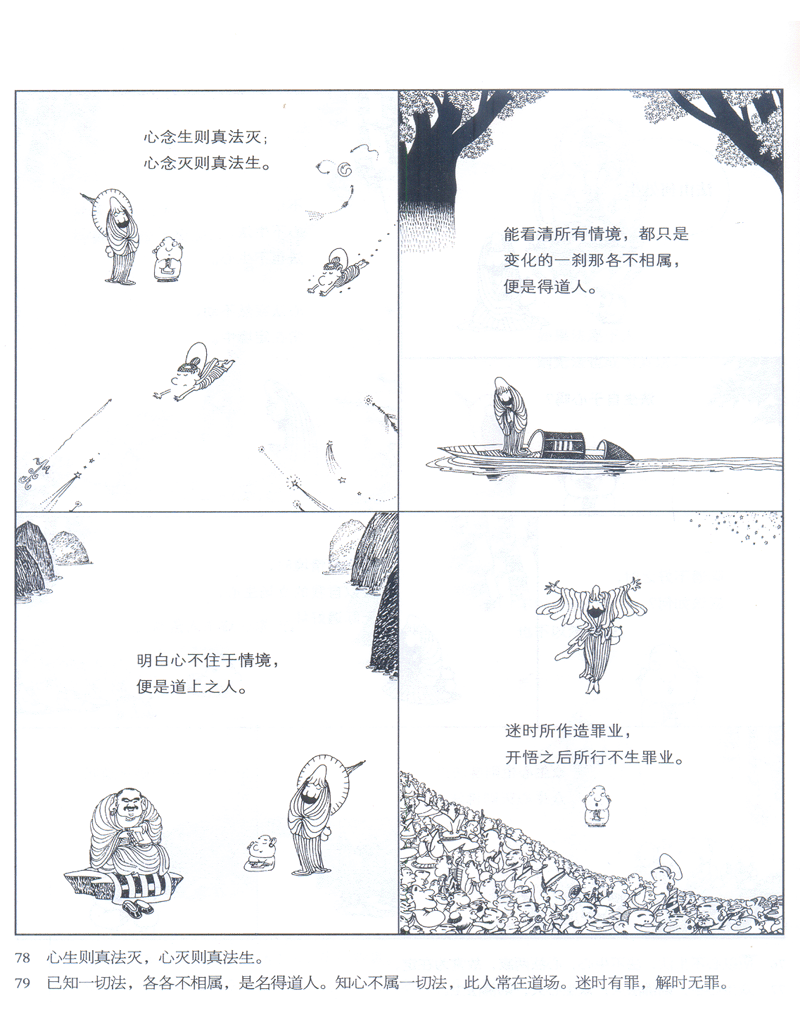 79 已知一切法各不相属(已经了知一切的存在皆空无自性,常人所认为的生死、是非、善恶非其所本有,皆由自心情想分别而生),是名得道人。知心不属一切法,此人常在道场(心法两空。一切法皆唯识所现,非心本有,故云心不属一切法)。迷时有罪,解时无罪(罪无自性,罪本空故)。 |