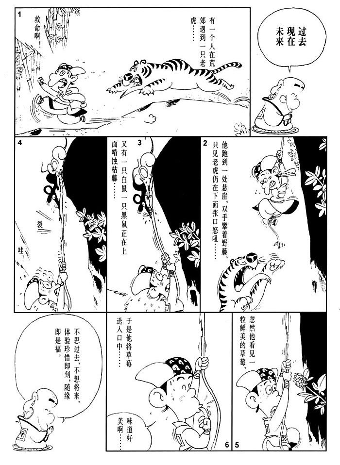 前面的那只老鼠是恐惧感,未来心。 后面的那只老虎是紧迫感,过去心。 中间的那根藤条是危机感,现在心。 其实佛与众生都吊在同一根人生的藤条上。佛能够放下,所以能够获得自在和解脱,品尝到那粒草莓。凡夫什么都放不下,所以既看不到那粒草莓,也吃不到那粒草莓。 人世间如同一个大旅店,只见来者,不见回头客。可是无论是帝王将相、才子佳人,还是普通的百姓,几乎没有一个生前放得下的。忙到头来,一个个没醒过梦来,不知怎么回事,就呜呼哀哉了。 世间万物本来就是变幻无常的,人们何必非要向未来寻个栖身之所? 生命在喘息之间,人们何必非要在不定处寻个落脚之处? 没有过去心的人,身后没有老虎。老虎如同身后的影子,你跑得越快,他追得越快。人们与其让过去追着自己往前跑,不如忘记过去,做回自己的主人。 什么是过去?瞬间已成过去。过去的种种争斗和不愉快如同老虎一样,你要让他追着跑,不累死也得被他吃掉。 《金刚经》云:“过去心不可得,现在心不可得,未来心不可得。” 人生如梦,过去心、现在心、未来心,如同梦中之梦。世间的一切如“梦幻泡影,如露亦如电”,世间的万有万像如同水中影,镜中花,似有实无。 当今,政治与经济相结合,产生出许多违背自然规律和道德准则的怪物,这些怪物使人们愈加的迷失本性,乃至沦为物欲的奴隶,为了虚幻不实的东西变得疯狂。因此,学佛者必须学会把持自己,以免在物欲的洪流中迷失掉人生的正确方向,葬送掉宝贵的人生。 不怕同学笑话,直至今年7月,本人才买了人生中头一部手机,买了这部手机也是废物,一直关着。倒不是穷的买不起,关键是我觉得这东西既不代表人的身份,也没什么大用。 手机广告上称,船在大海中遇险,多亏其中的某人有部手机,才使全船的人获救。其实,人该不着死,没手机也死不了。商家为了赚钱,竟“忽悠”人。有谁会整天在船上呆着,又有多少条船会遇险?最终结果表明,手机这玩意不但没救多少人,反而害得不少人因此犯罪、破财、生病和丧命。一些人拿着手机,没在船上得救,倒死在路上了,因为打电话时太专心,走马路中间去了……。 写于:2007年10月15日