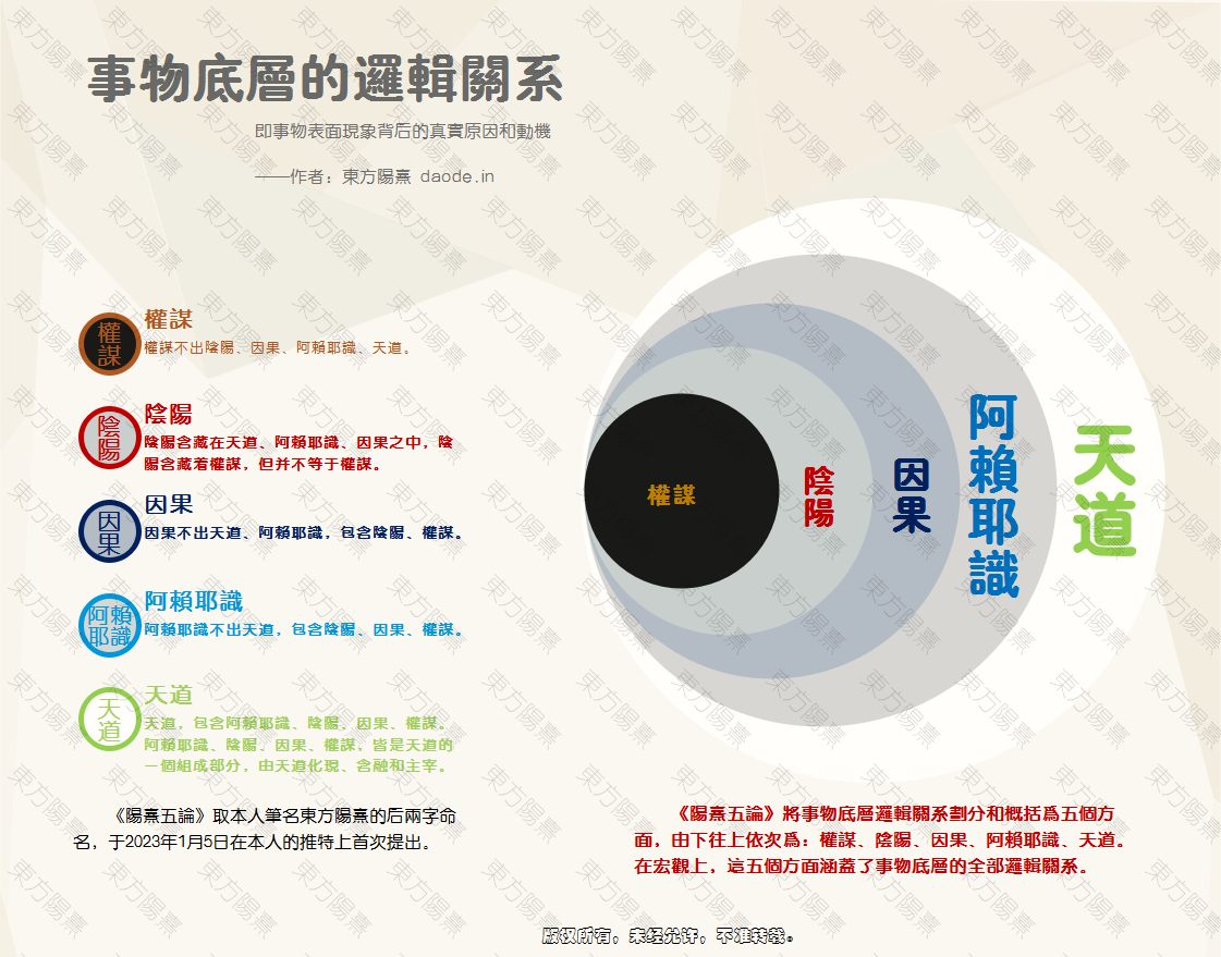 The Power Schemes, Yin and Yang, Cause and Effect, and Alaya Consciousness mentioned in The Five Theories of Yangxi are like the paintings on a blank sheet of paper—they are all generated by, sustained through, and governed by the Heavenly Tao. Though the Power Schemes, Yin and Yang, Cause and Effect, and Alaya Consciousness may appear to operate independently, none of them exist outside the control of the Heavenly Tao.